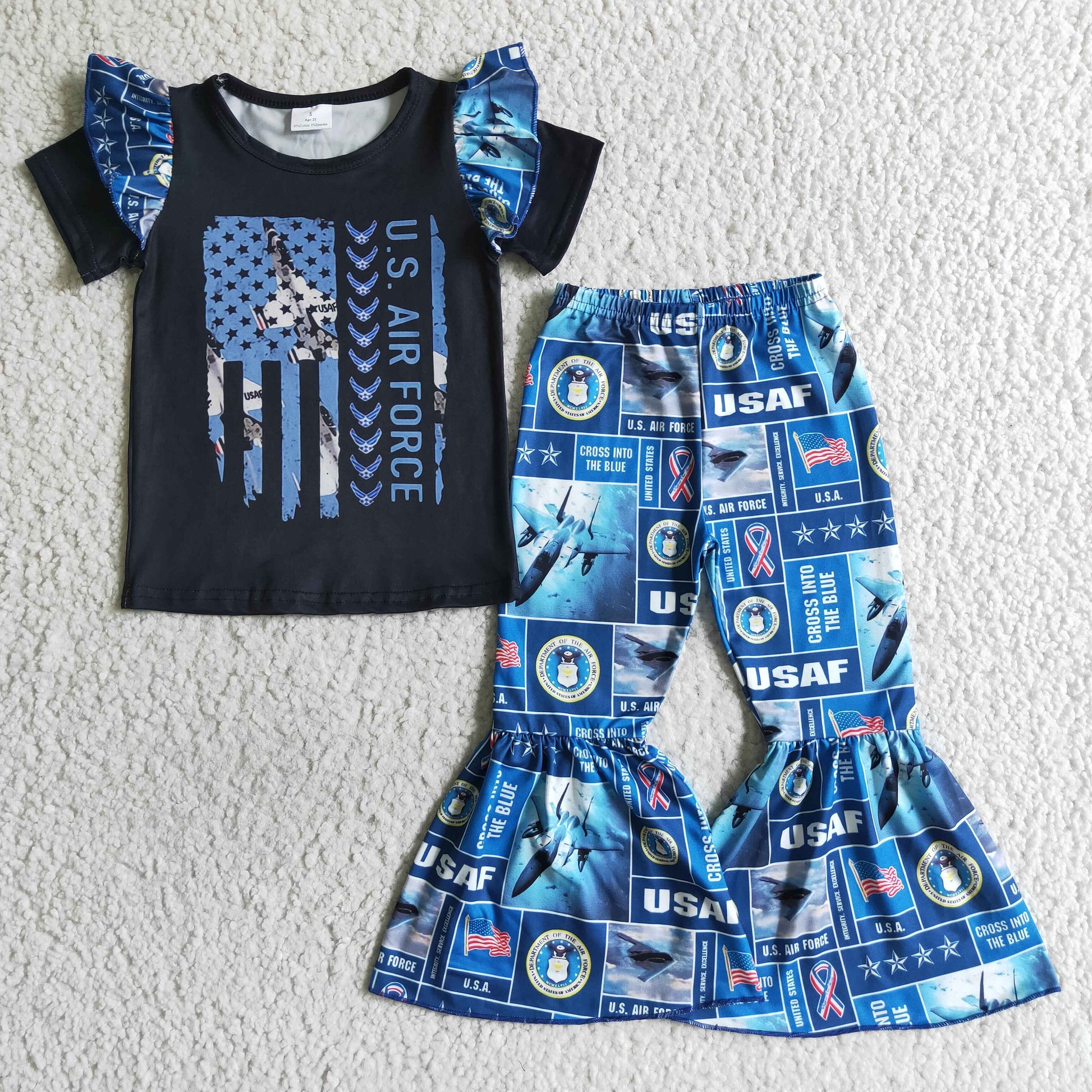 A4-4 Blue And Black Air Force Flag Girls Short Sleeve Bell Bottom Pants Outfits