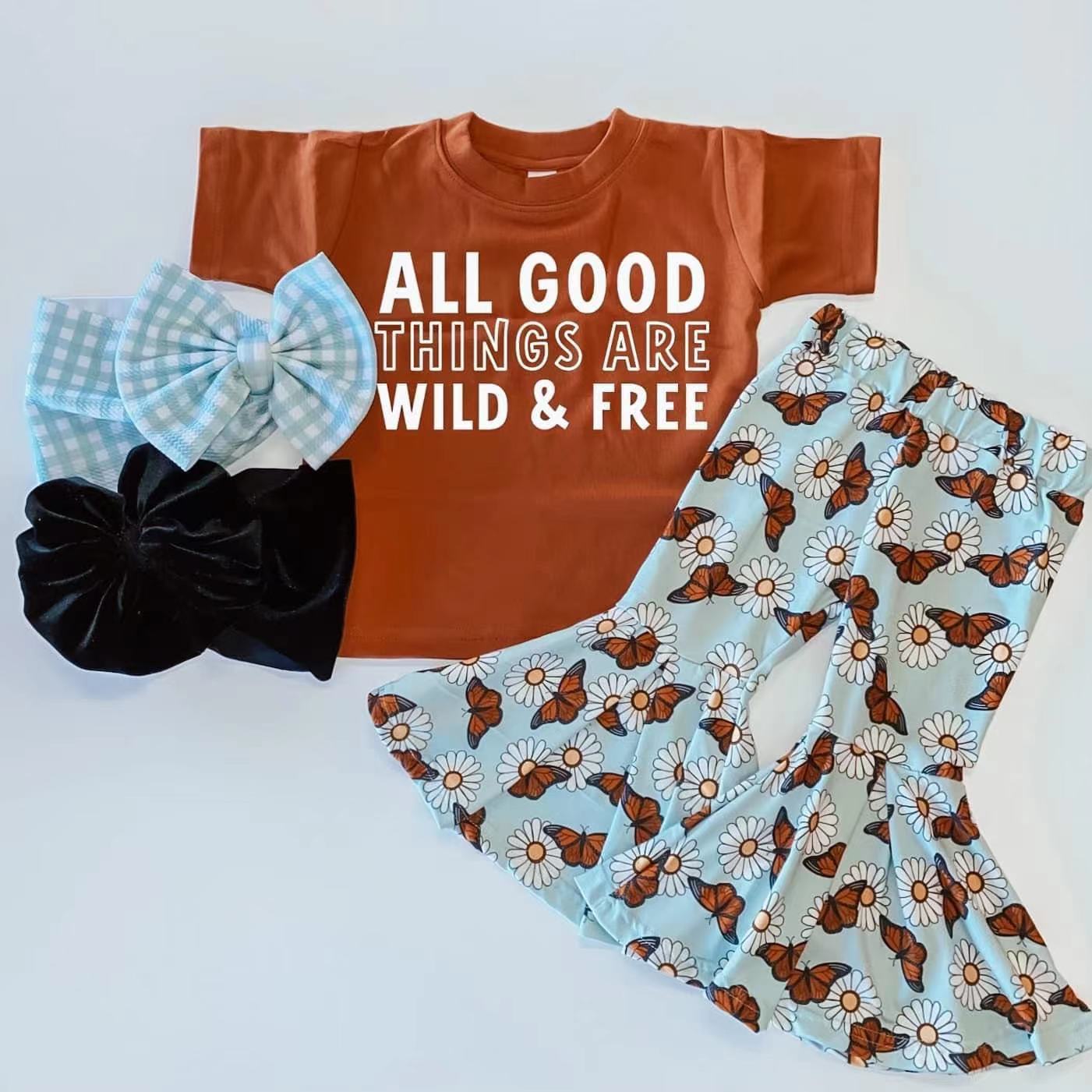 promotion RTS E7-28 Floral Butterfly All Good Things Are Wild & Free With Bow 3pcs Girls Short Sleeve Bell Bottom Pants Outfits