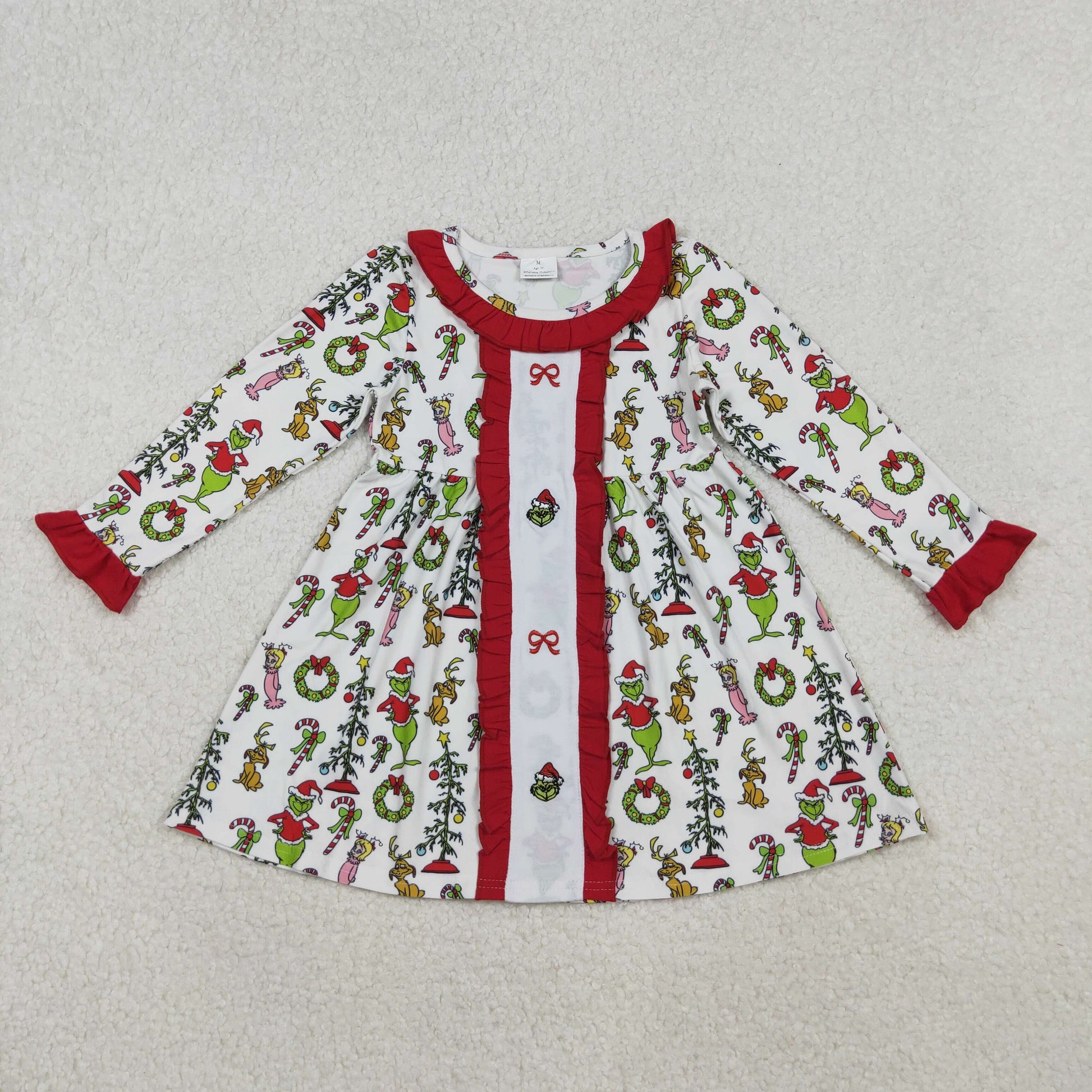 GLD1289 Embroidered Christmas Grinch Red Ruffle Long Sleeve Dresses for Girls 202510 RTS
