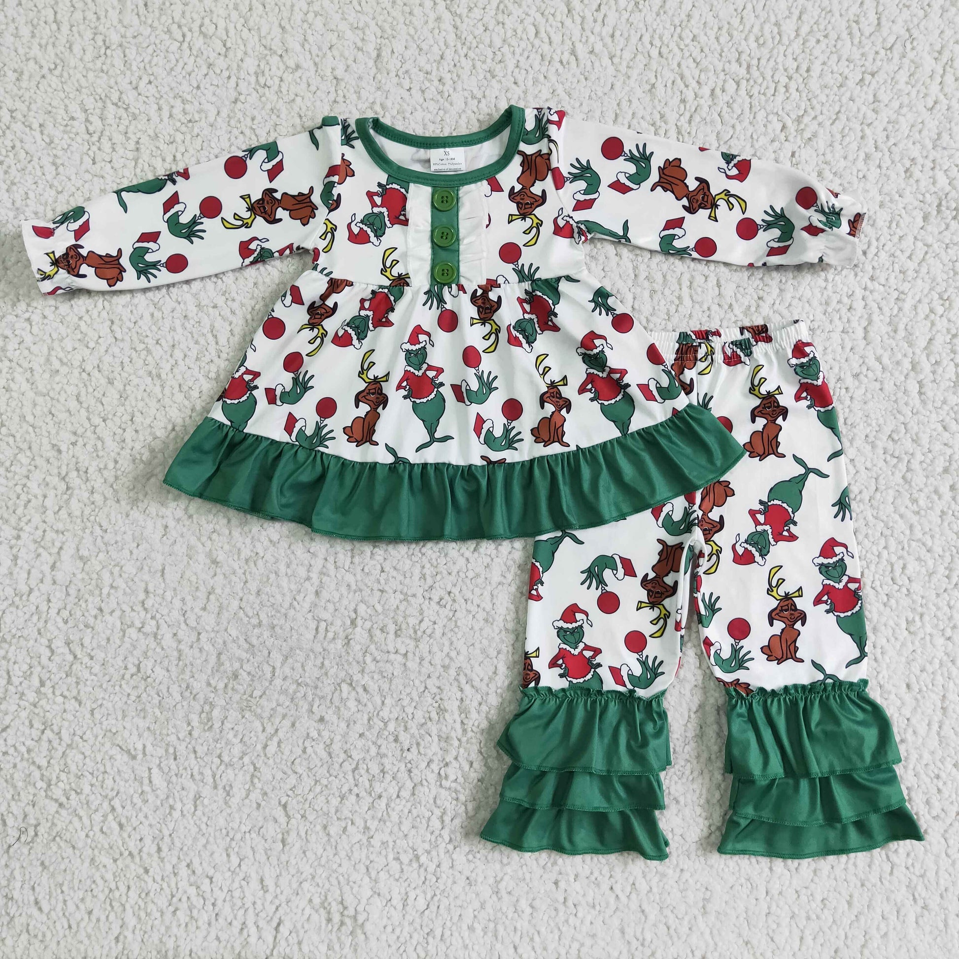 GLP0041 Christmas Green Red Cartoon Ruffles Tunic Girls Long Sleeve Pants Outfits