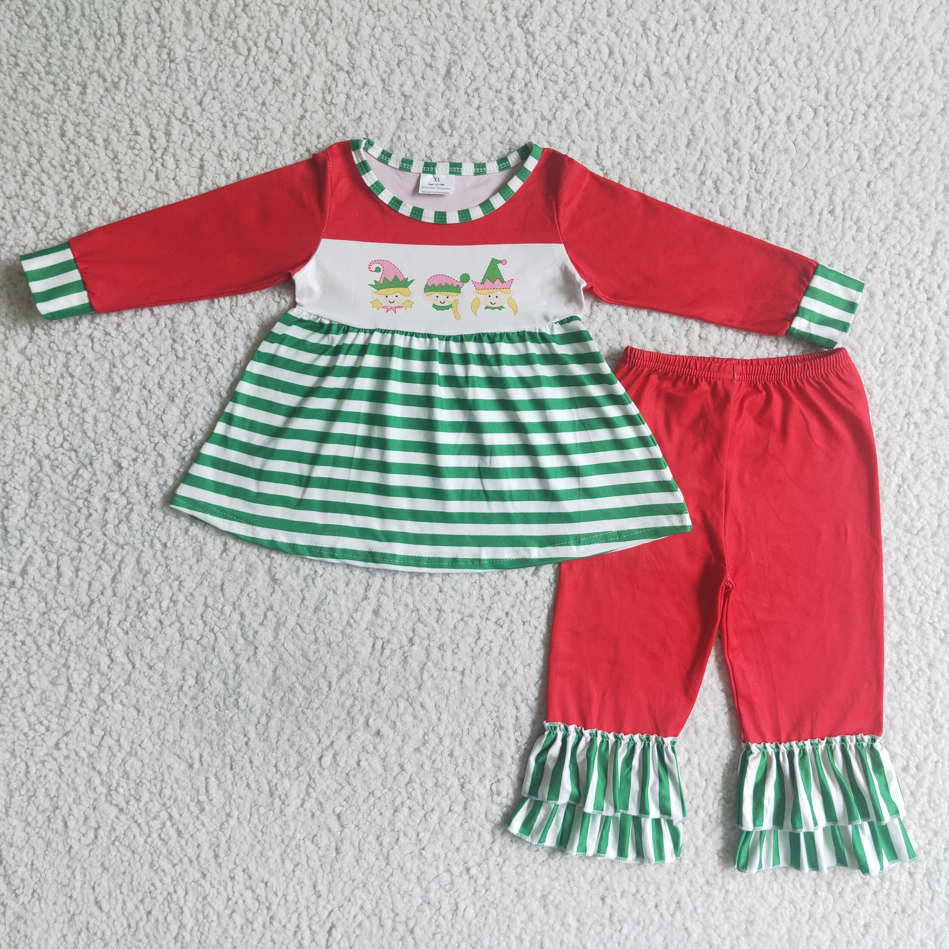 GLP0057 Christmas Green Stripes Red Cartoon Ruffles Tunic Girls Long Sleeve Pants Outfits
