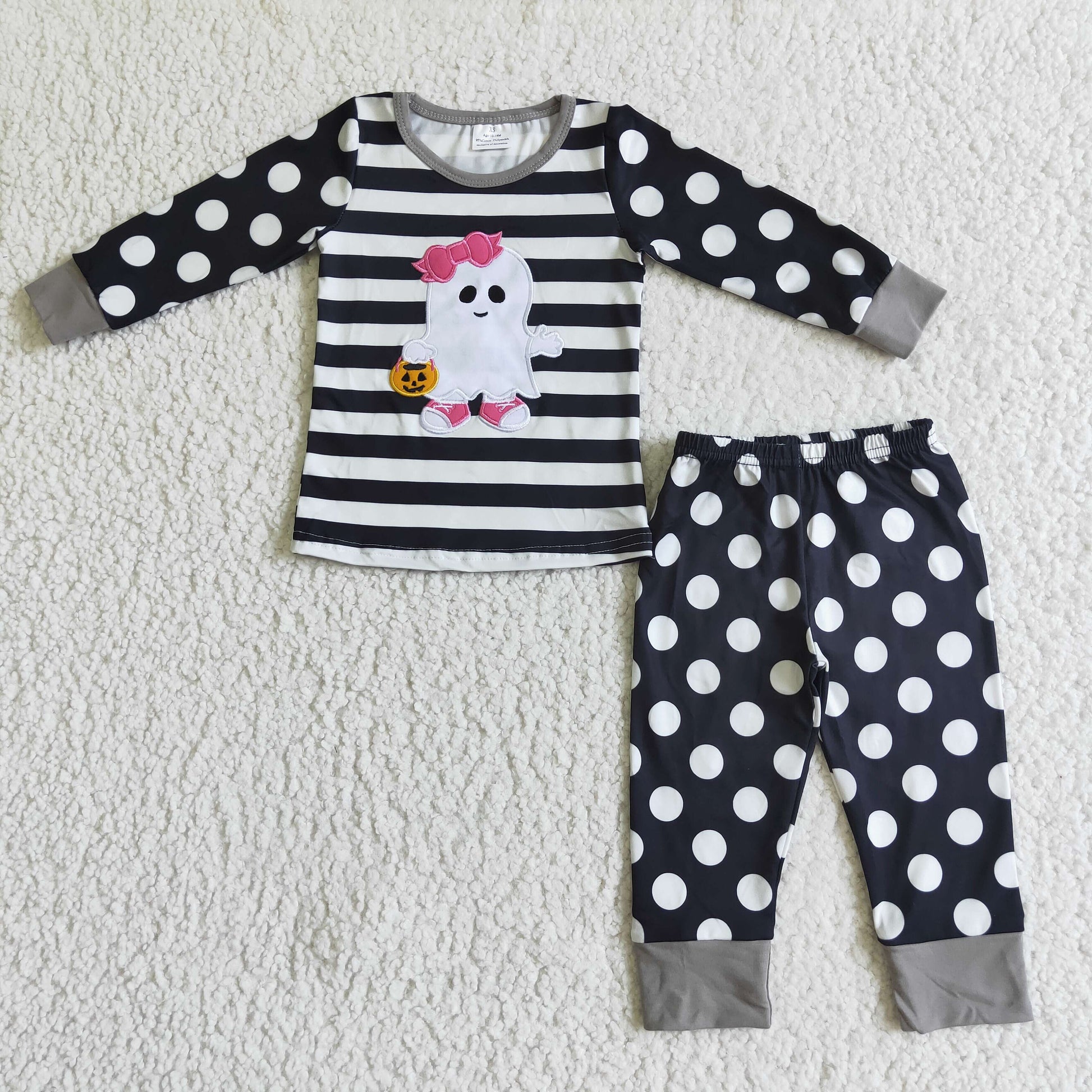 GLP0066 Halloween Black Stripes Dots Ghost Cartoon Embroidery Girls Long Sleeve Pajamas