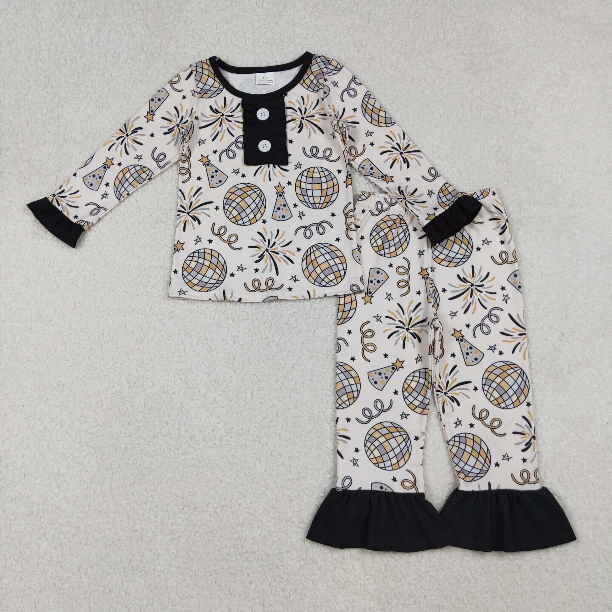 GLP2563-XS-3XL New Year Fireworks Ball Ruffle Long Sleeve Top Pants Girls Pajamas Set 202510 RTS