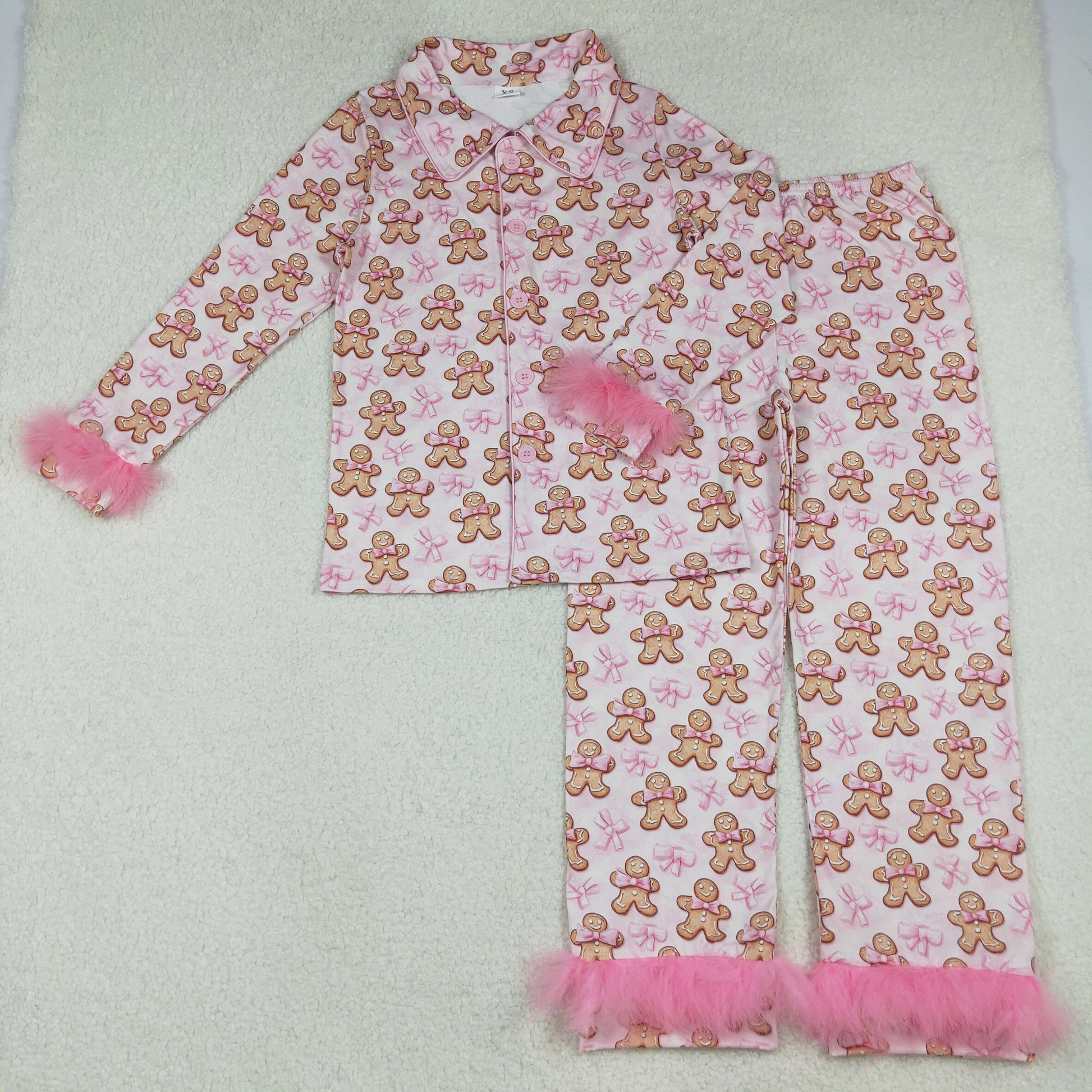 GLP2716 Adult Female Christmas Gingerbread Man Bows Pink Plush Long Sleeve Pants Pajamas Sets 202510 RTS