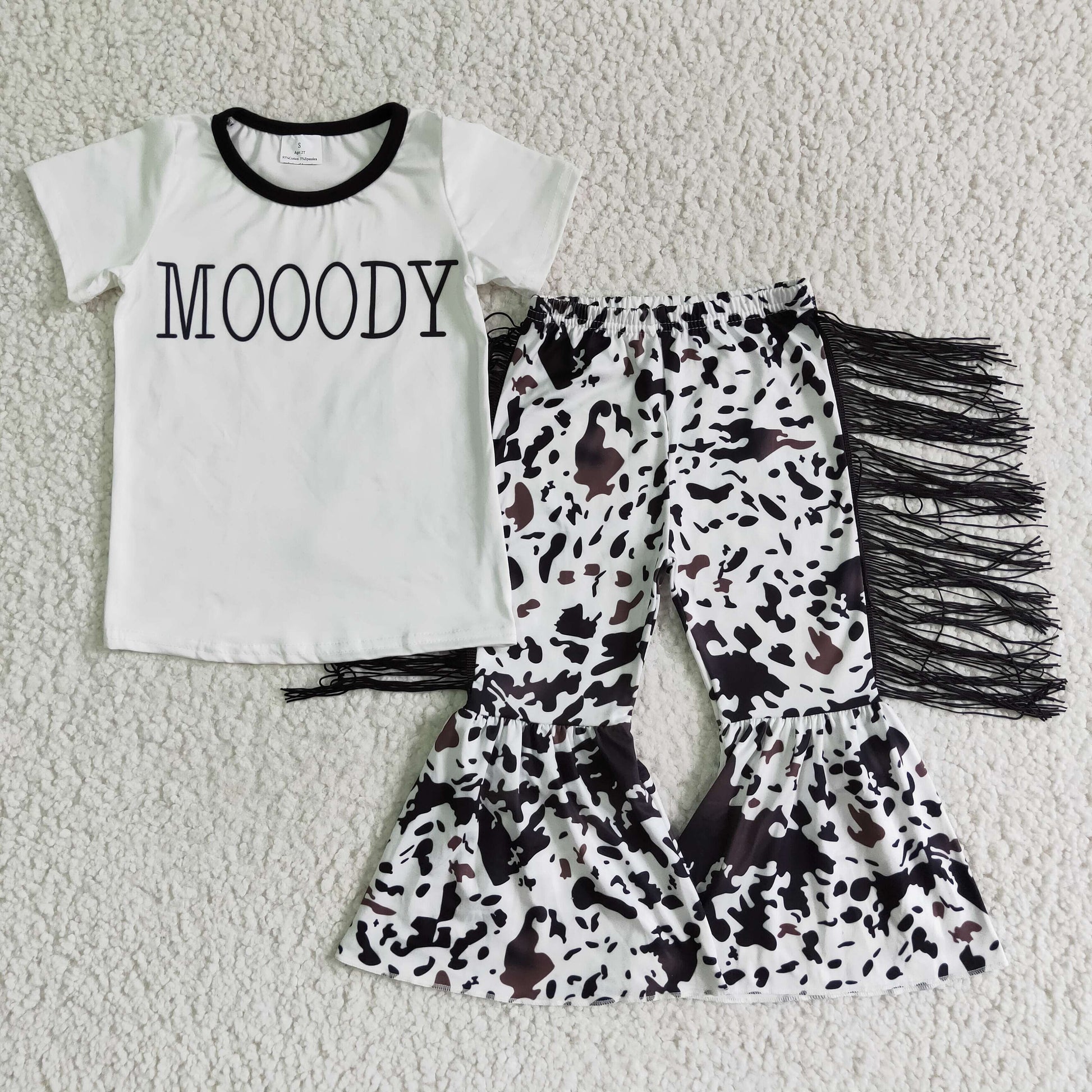 GSPO0160 Mooody Black White Cow Print Tassel Girls Short Sleeve Bell Bottom Pants Outfits