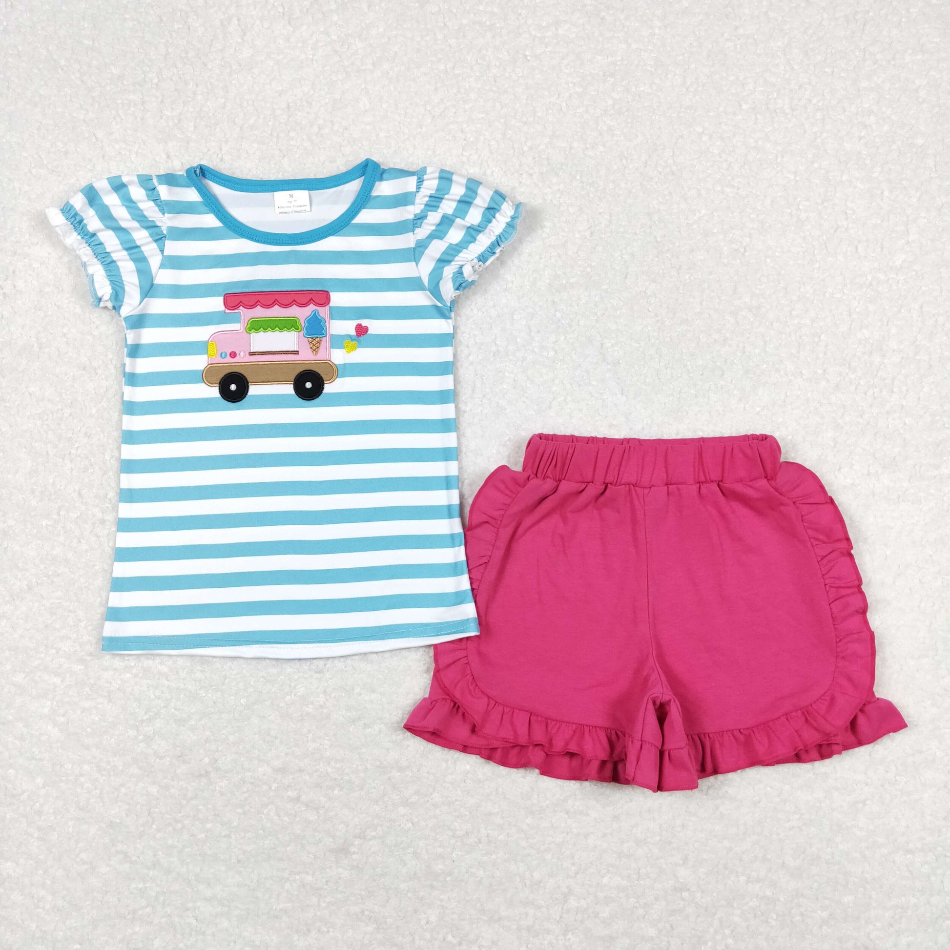GSSO0580 ice cream truck blue stripe short sleeve rose red ruffle shorts sets girls boutique outfit 20240408 RTS