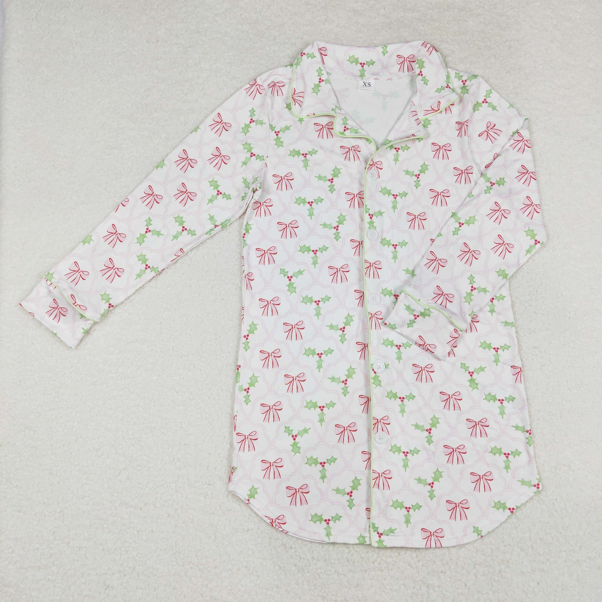 GT0661 Adult female pink bow pattern leaves white long sleeve top