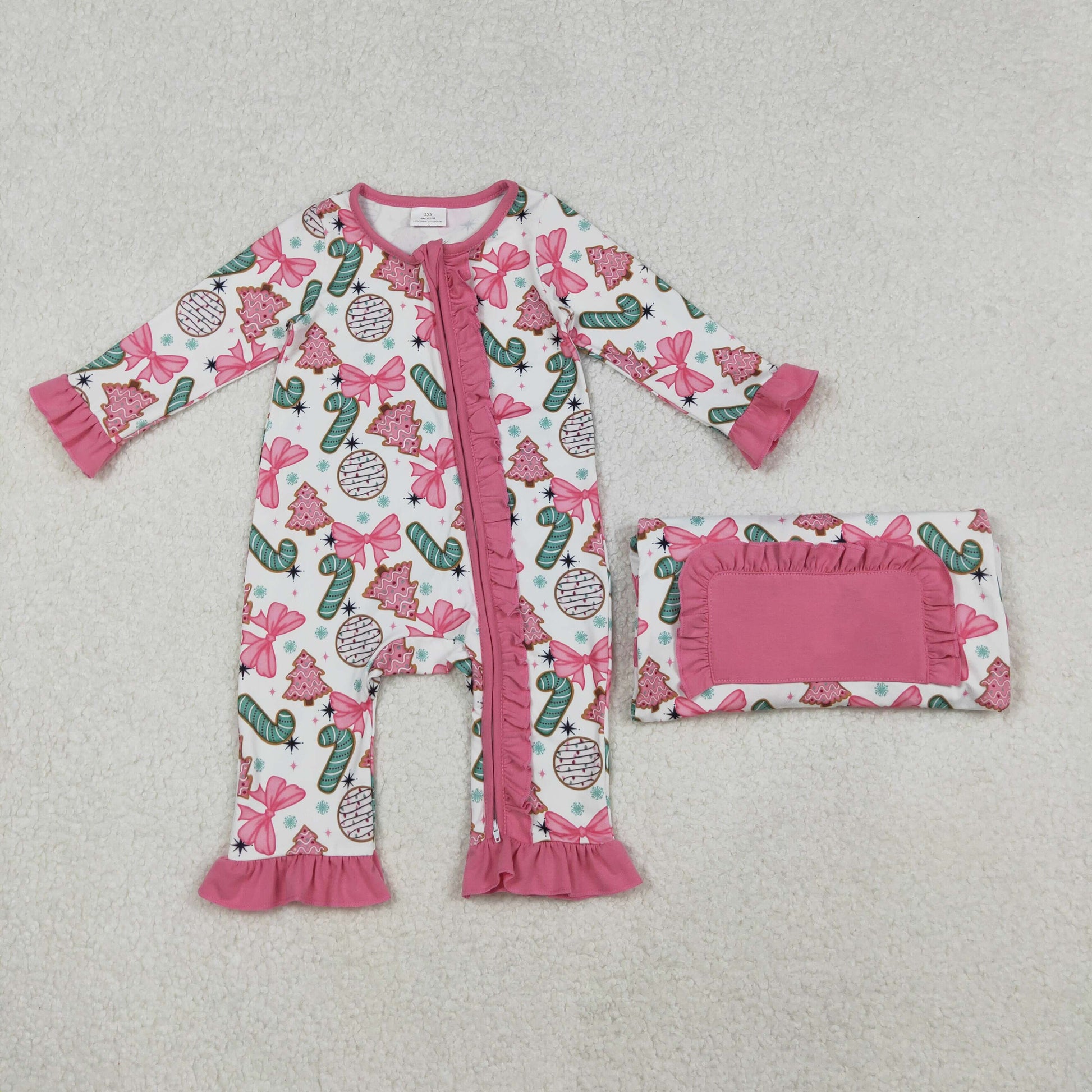 LR2486 Christmas Bows Cane Star Pink Ruffle Zippy Long Sleeve Girls Romper 202510 RTS