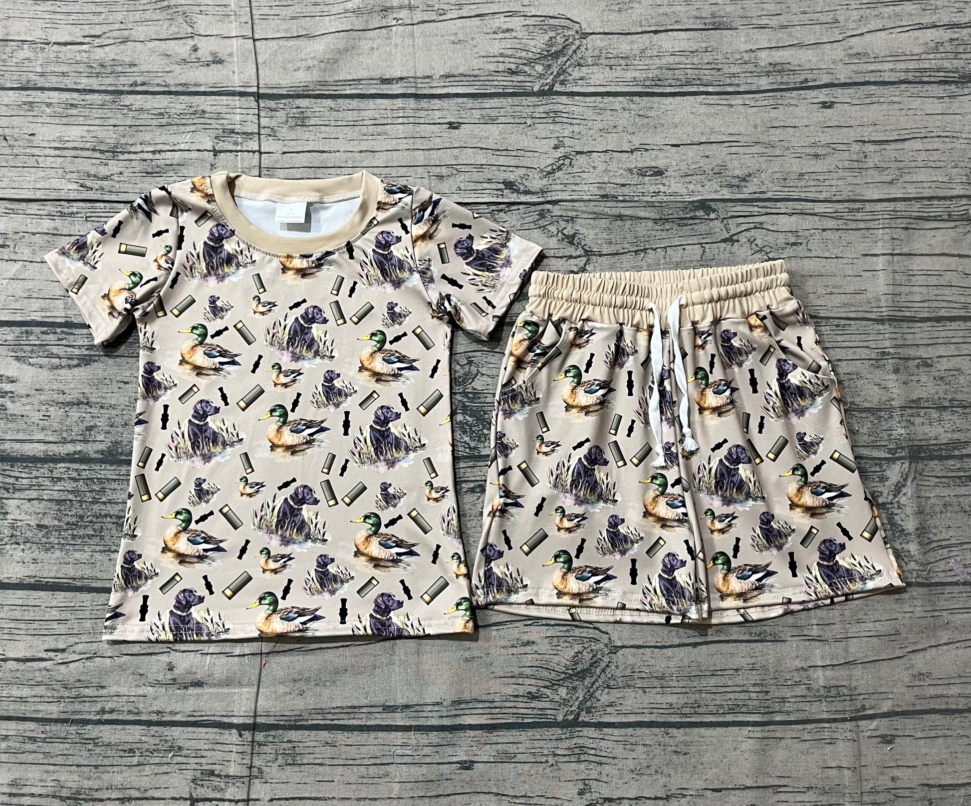 NO MOQ preorder BSSO1727 Puppy Duck Hunting Gray Green Short Sleeve Shorts Boys Sets 202512