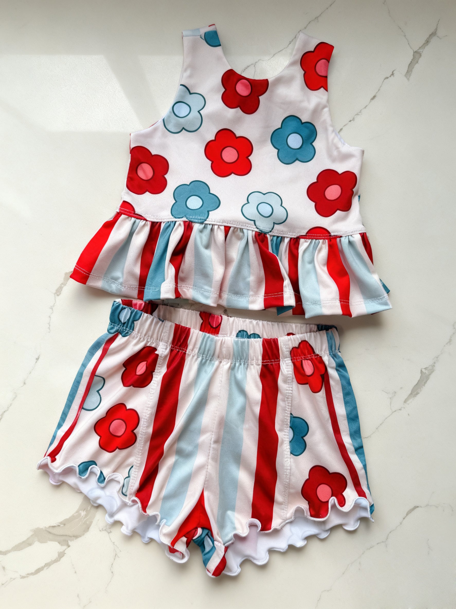 MOQ 5 PCS Preorder GSSO2893 Red Blue Flower Stripe Sleeveless Shorts Girls Sets 202511