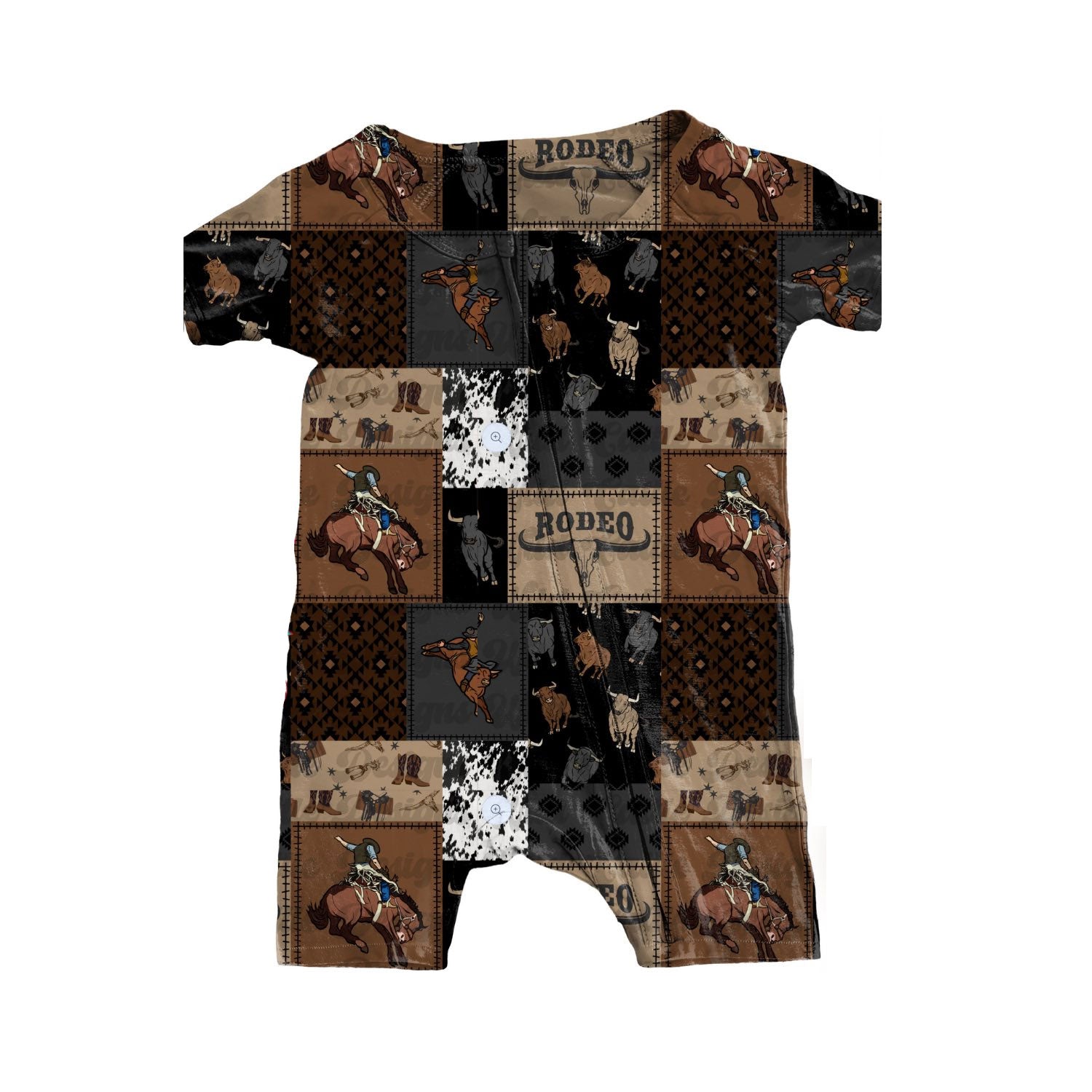MOQ 5 PCS preorder SR3545 Cowboy Rodeo Horse Riding Brown Zipper Short Sleeve Boys Romper 202511