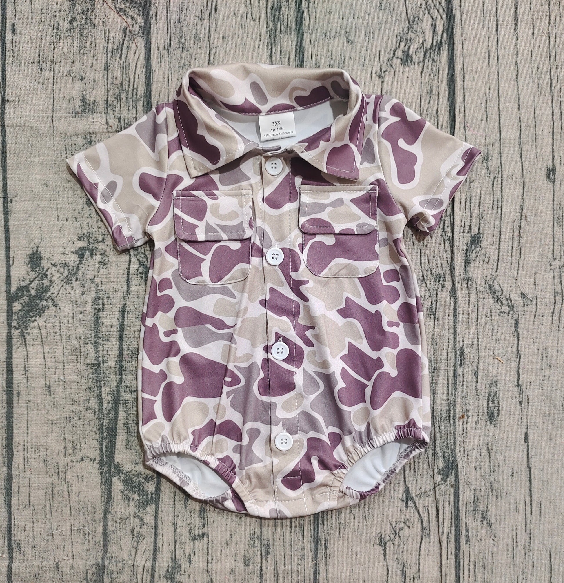 NO MOQ preorder SR3652 Gray Brown Camouflage Buttons Short Sleeve Boys Bubble Romper 202512