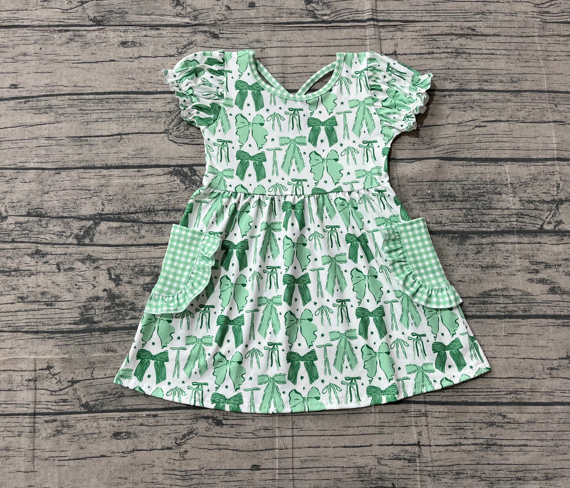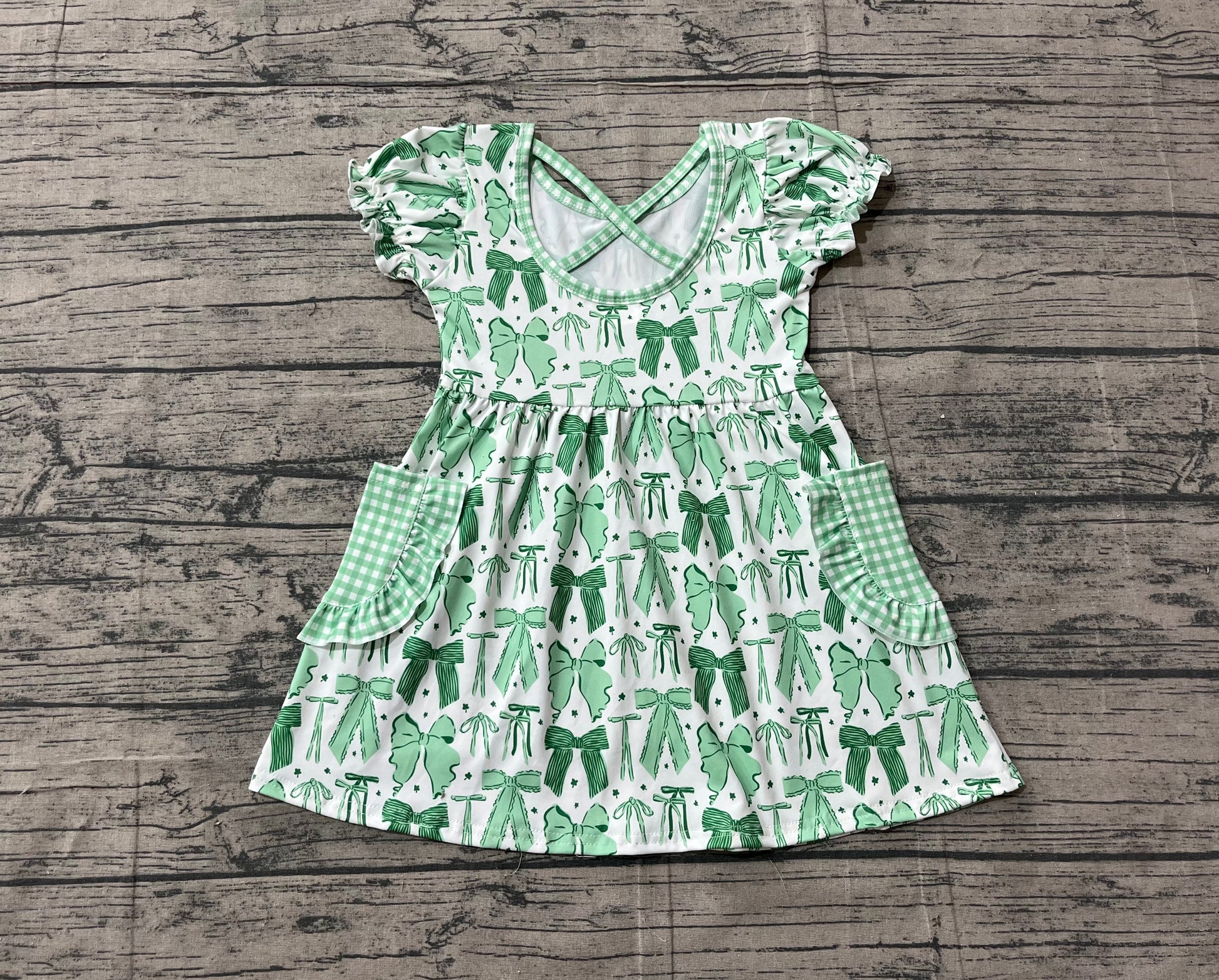 NO MOQ Preorder GSD2903 St. Patrick's Day Clover Bow Pattern Green Plaid Pocket Short Sleeve Dresses for Girls 202511