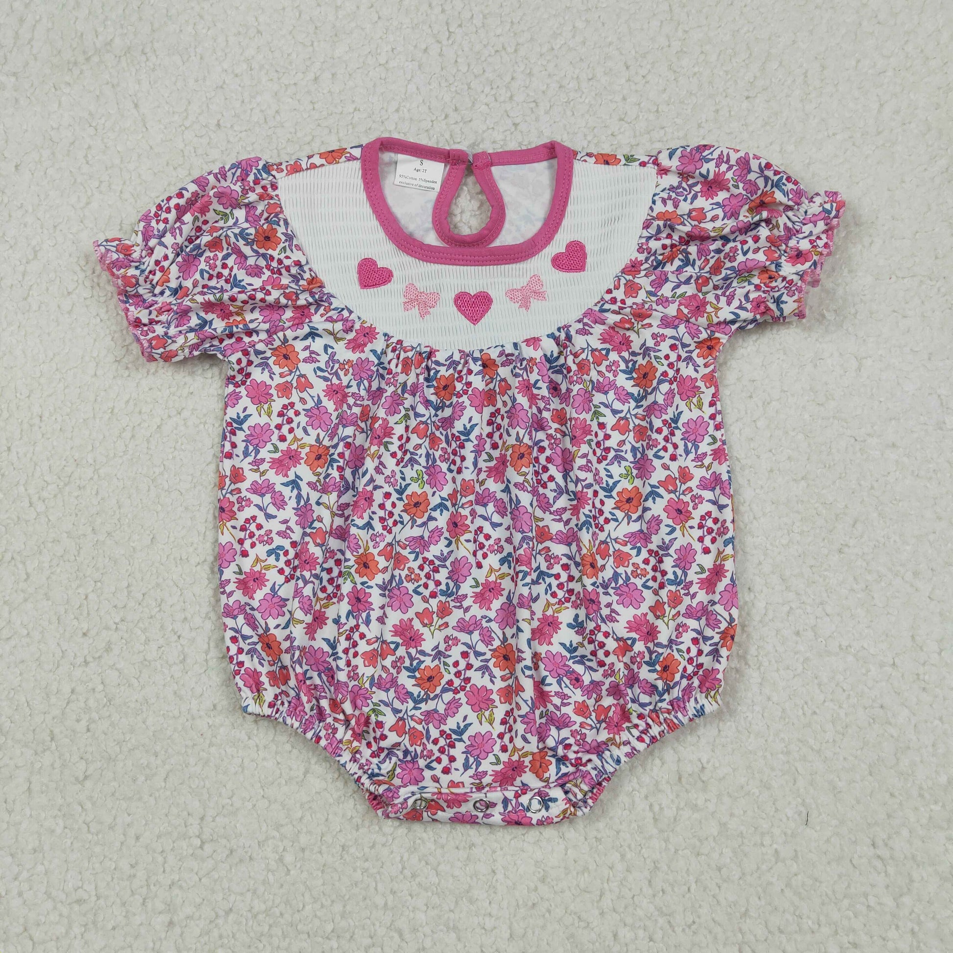 SR3465 Smocked Valentines Day Pink Love Bows Short Sleeve Girls Bubble Romper 202512 RTS Sibling
