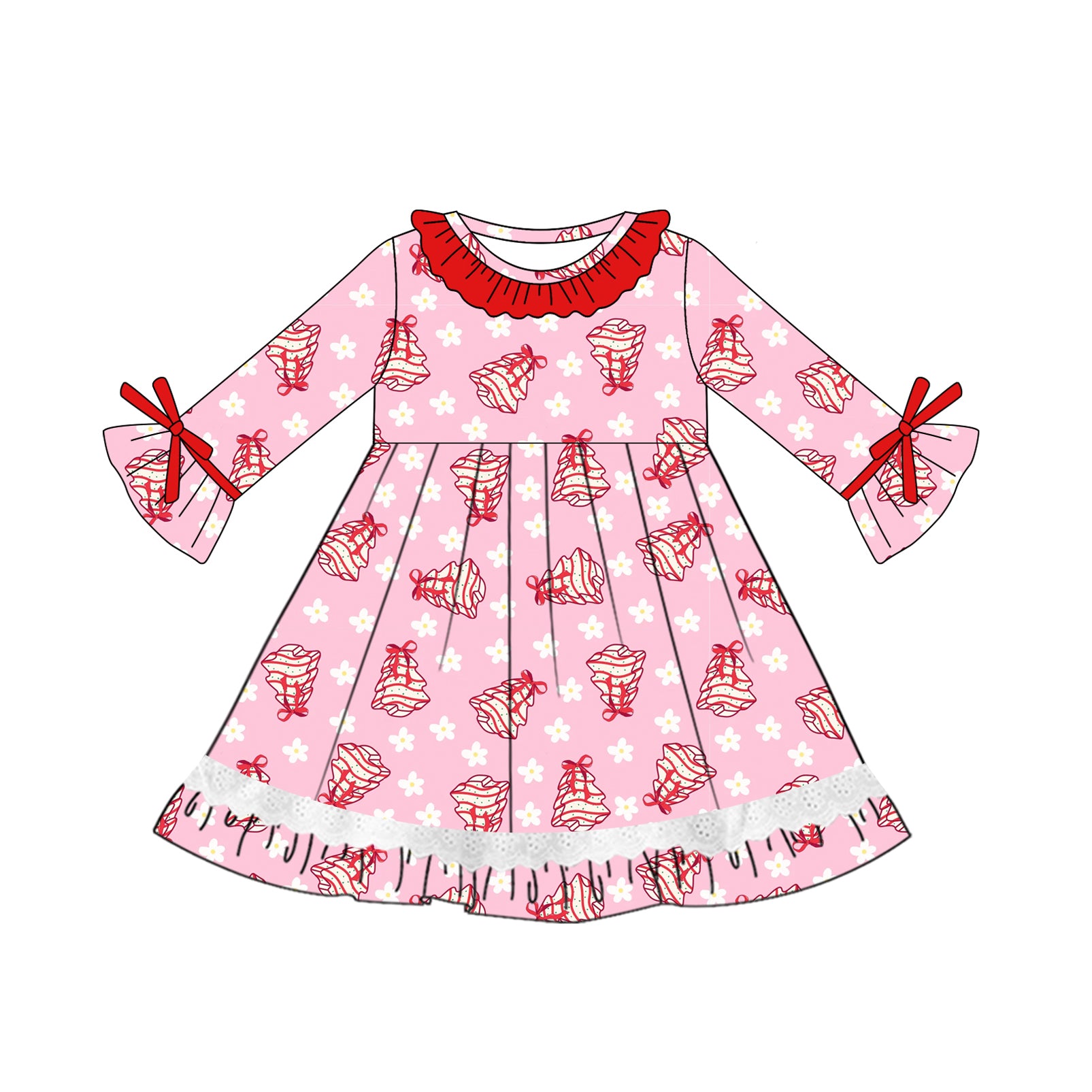 Preorder GLD1050 Flower Bow Santa Tree Red Ruffle Pink Long Sleeve Dress Girls Boutique Outfit 202505