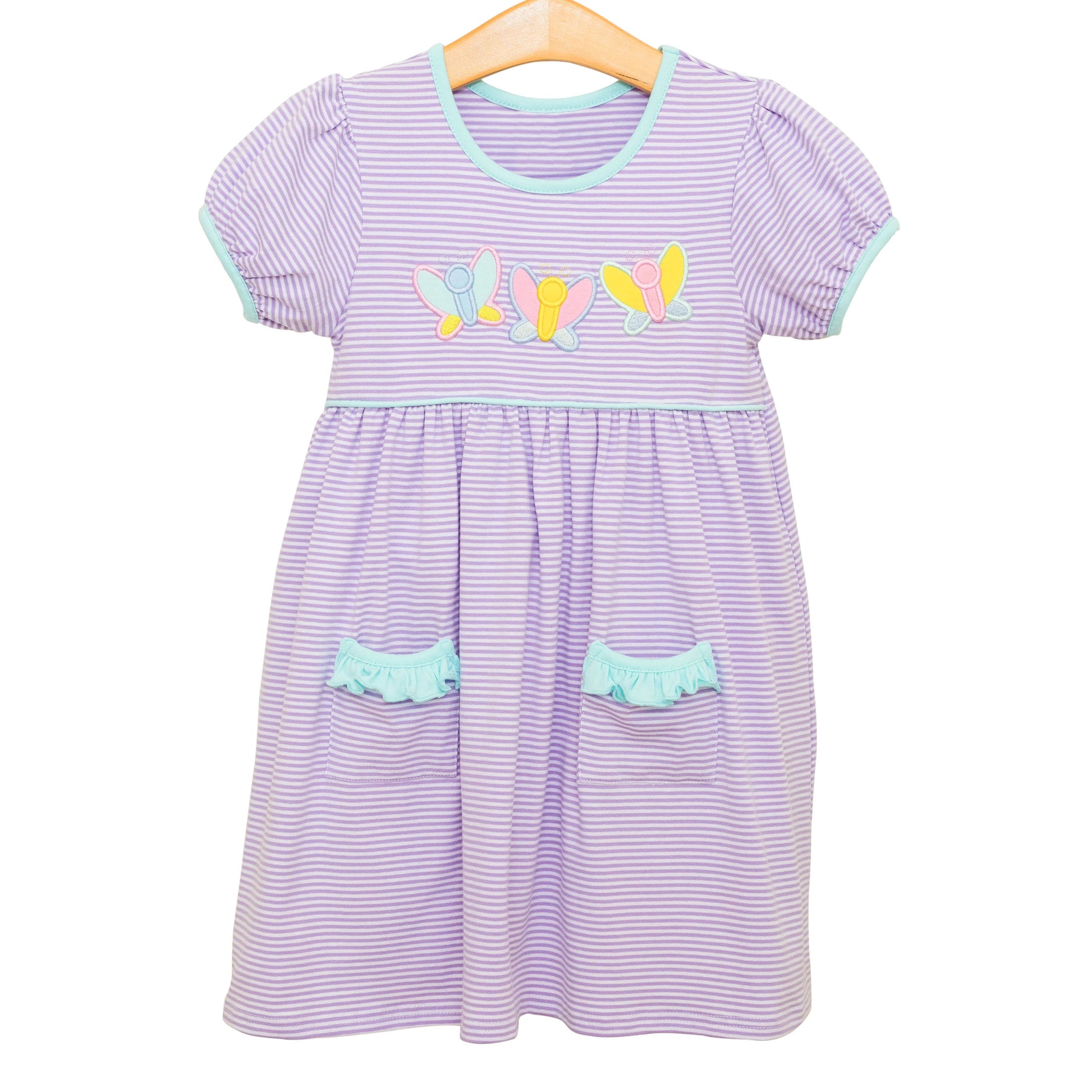 preorder GSD2239 Purple Striped Bows Pocket Short Sleeve Dress Girls Boutique Clothes 202503
