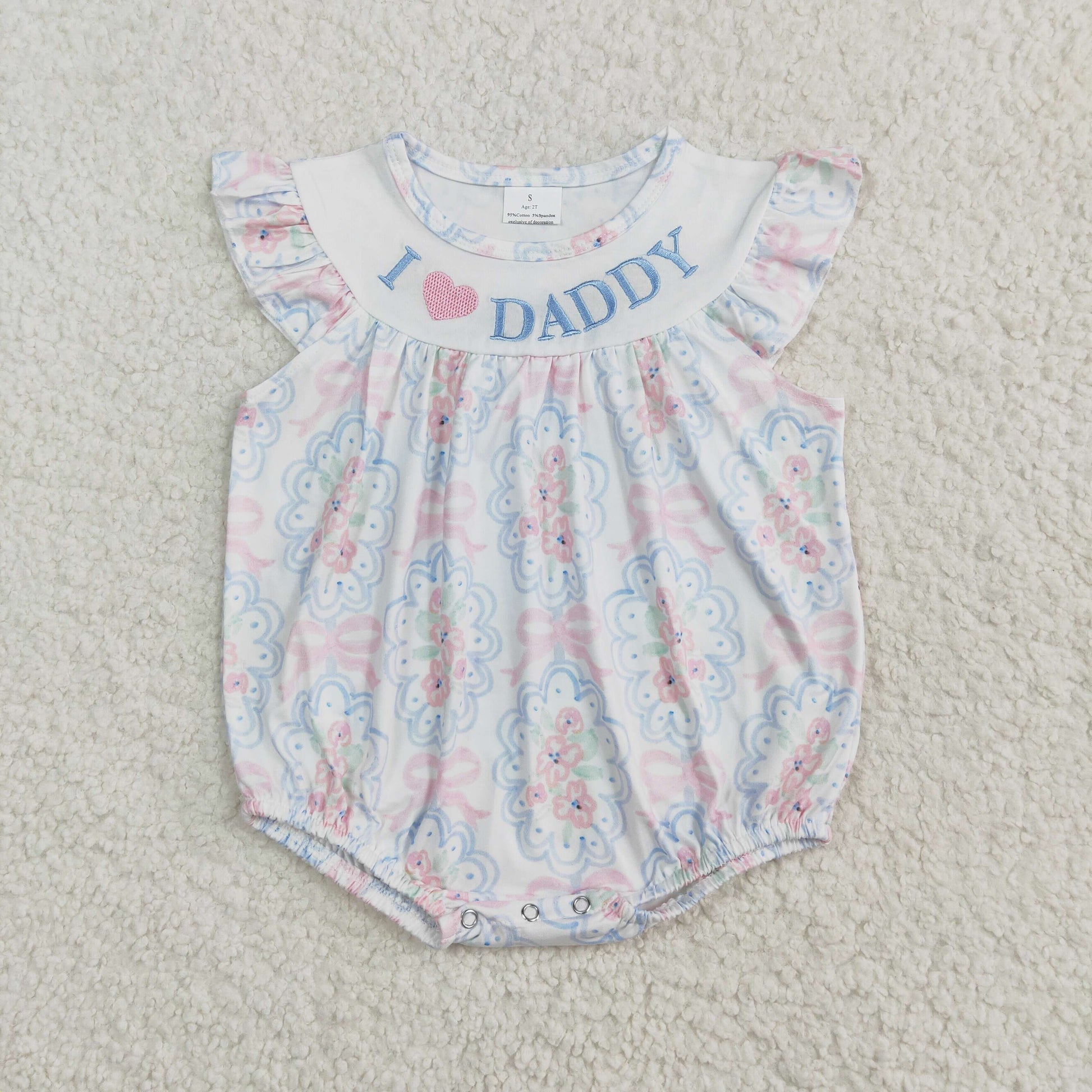 SR2946 I Love Daddy Embroidered Pink Blue Flower Bows Fly Sleeve Romper Baby Girl Boutique Summer Clothes 202504 RTS