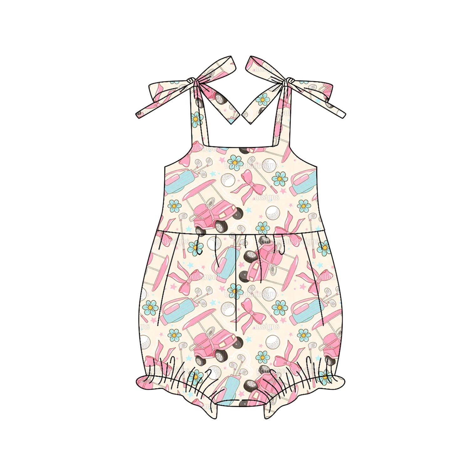 Preorder SR3140 Girls Boutique Flower Golf Car Beige Sling Halter Bubble Romper 202505