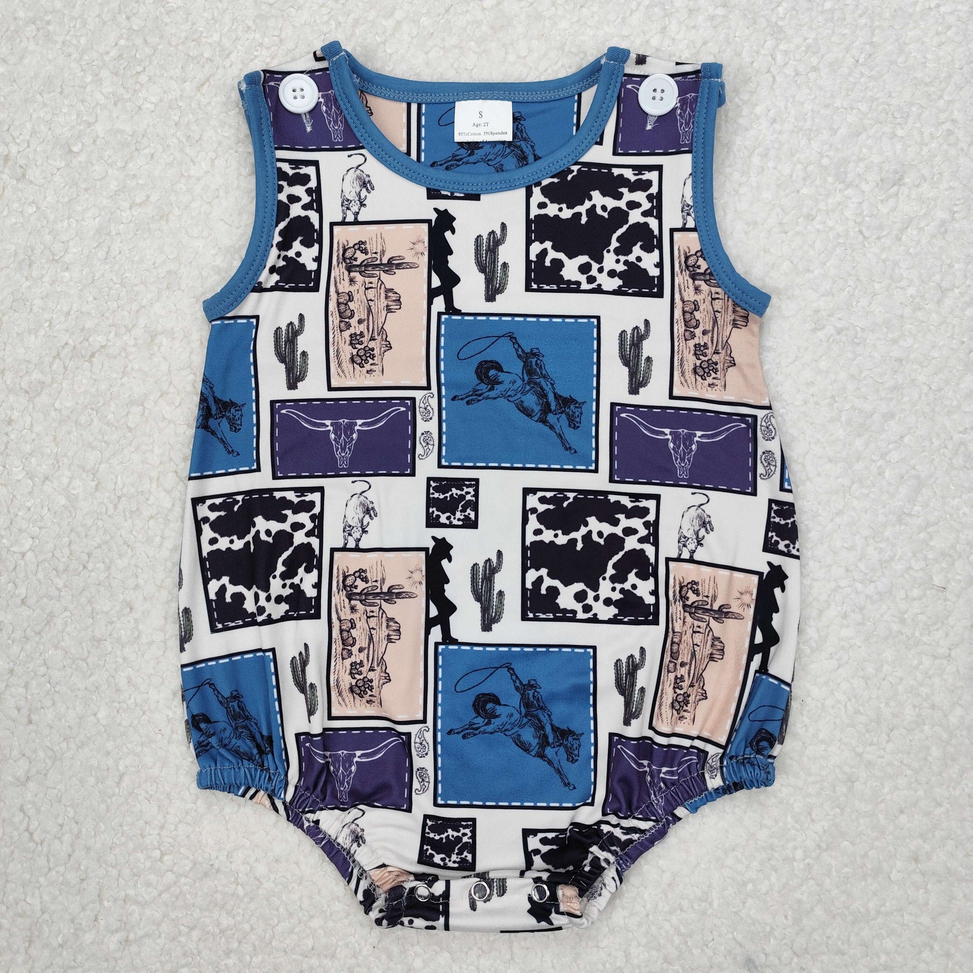 SR2700 Western Rodeo Fashion Blue Cactus Sleeveless Romper Boys Boutique Outfits 202503 RTS