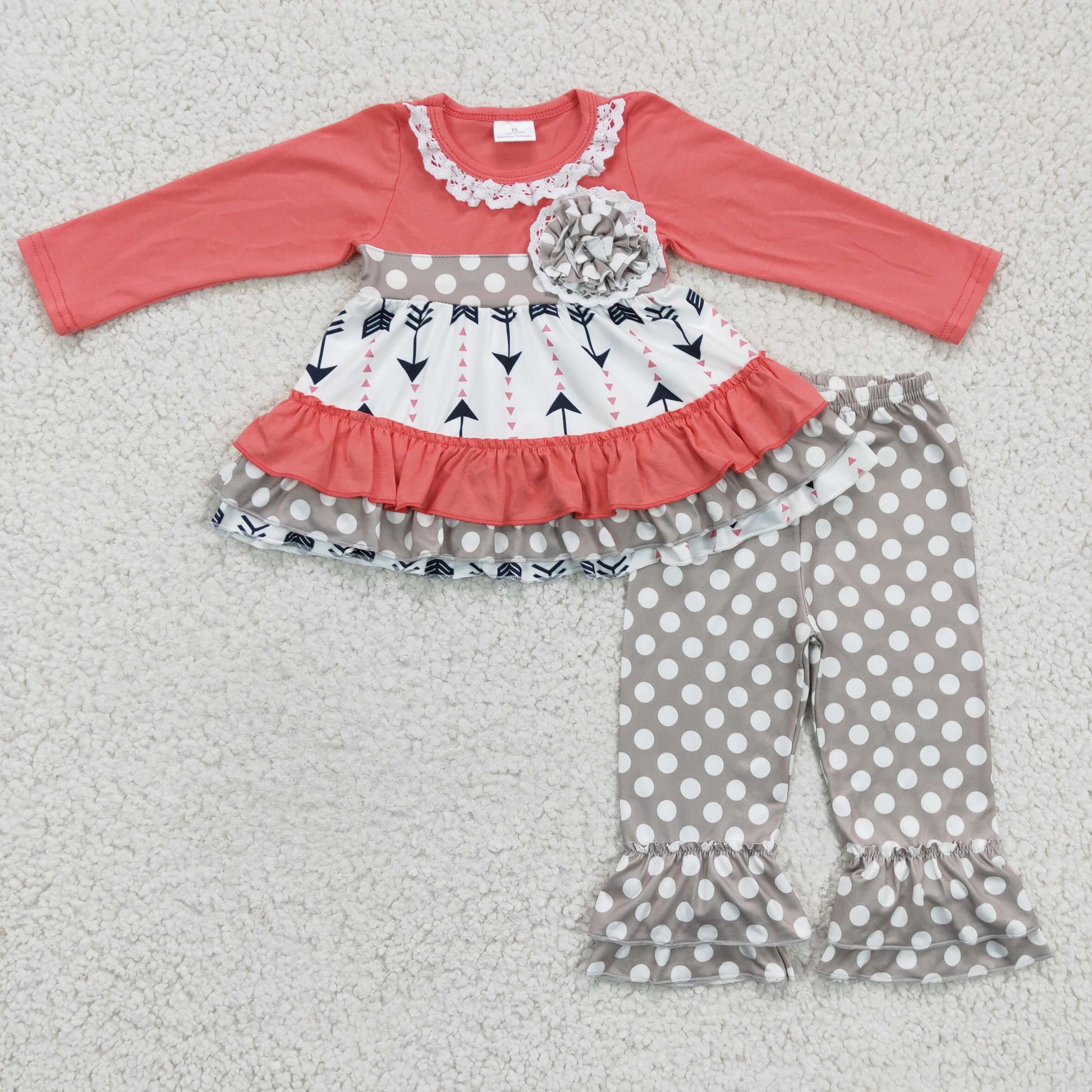 Clearance 6 A24-18 Valentine's Day Pink Floral Dots Ruffles Tunic Girls Long Sleeve Pants Outfits