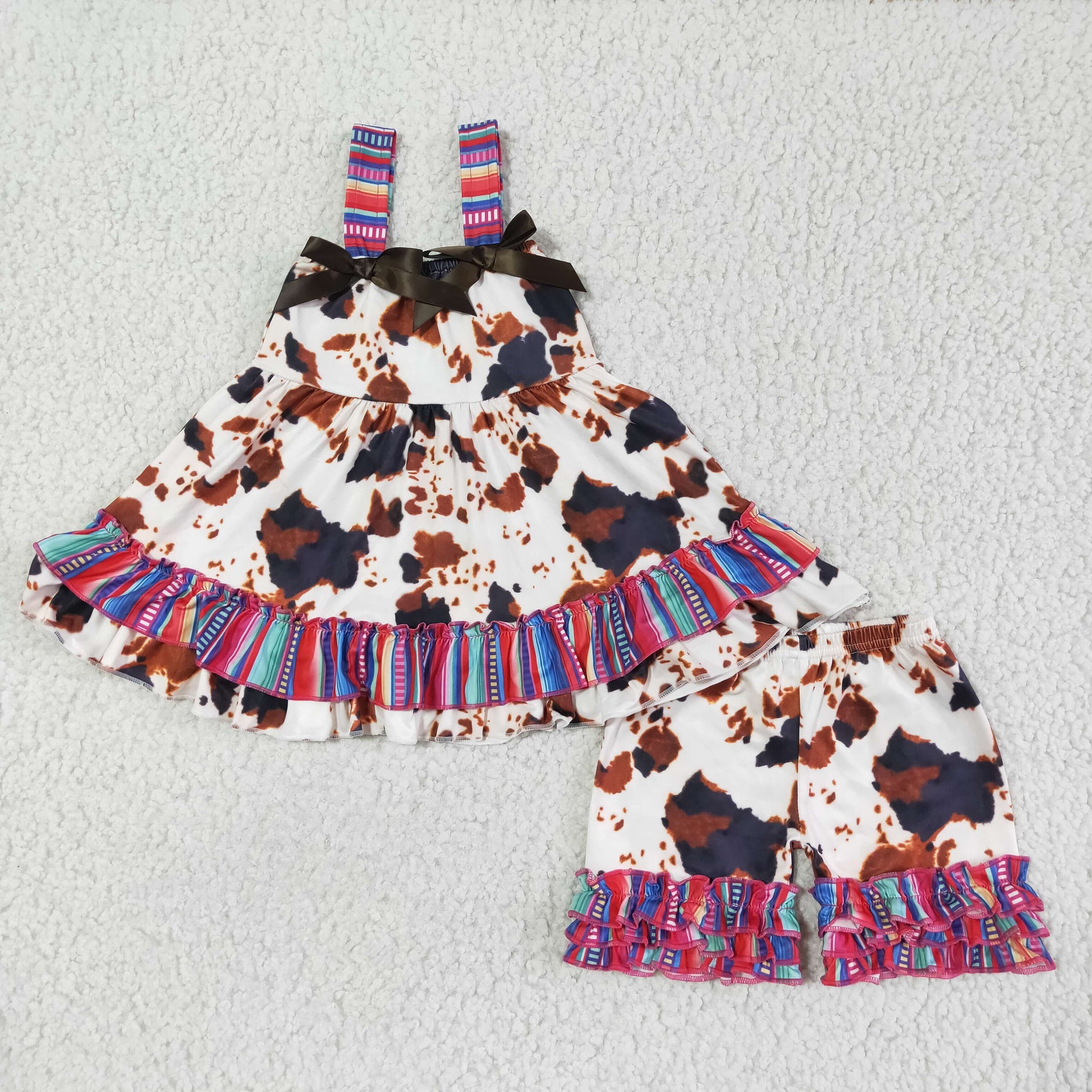 A14-13 Brown Cow Print Pink Girls Sleeveless Shorts Outfits