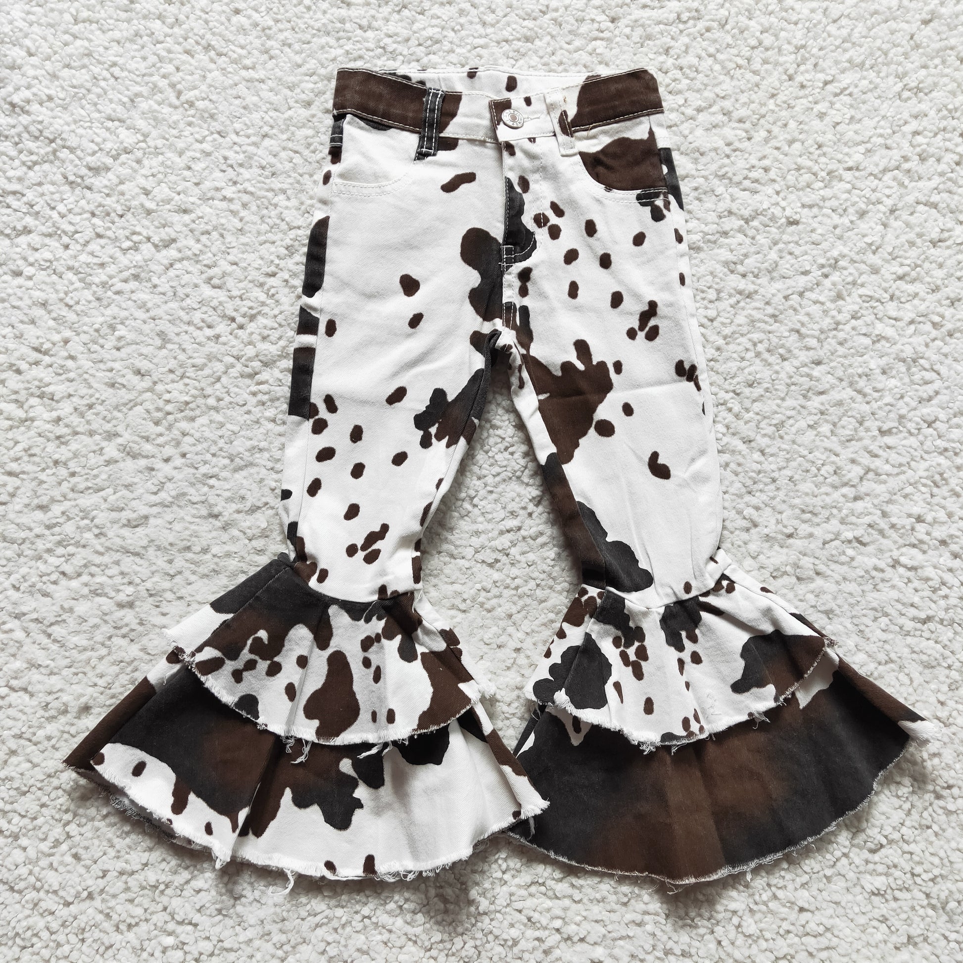 Aa-1 Brown Cow Print Girls Double Ruffles Denim Jeans