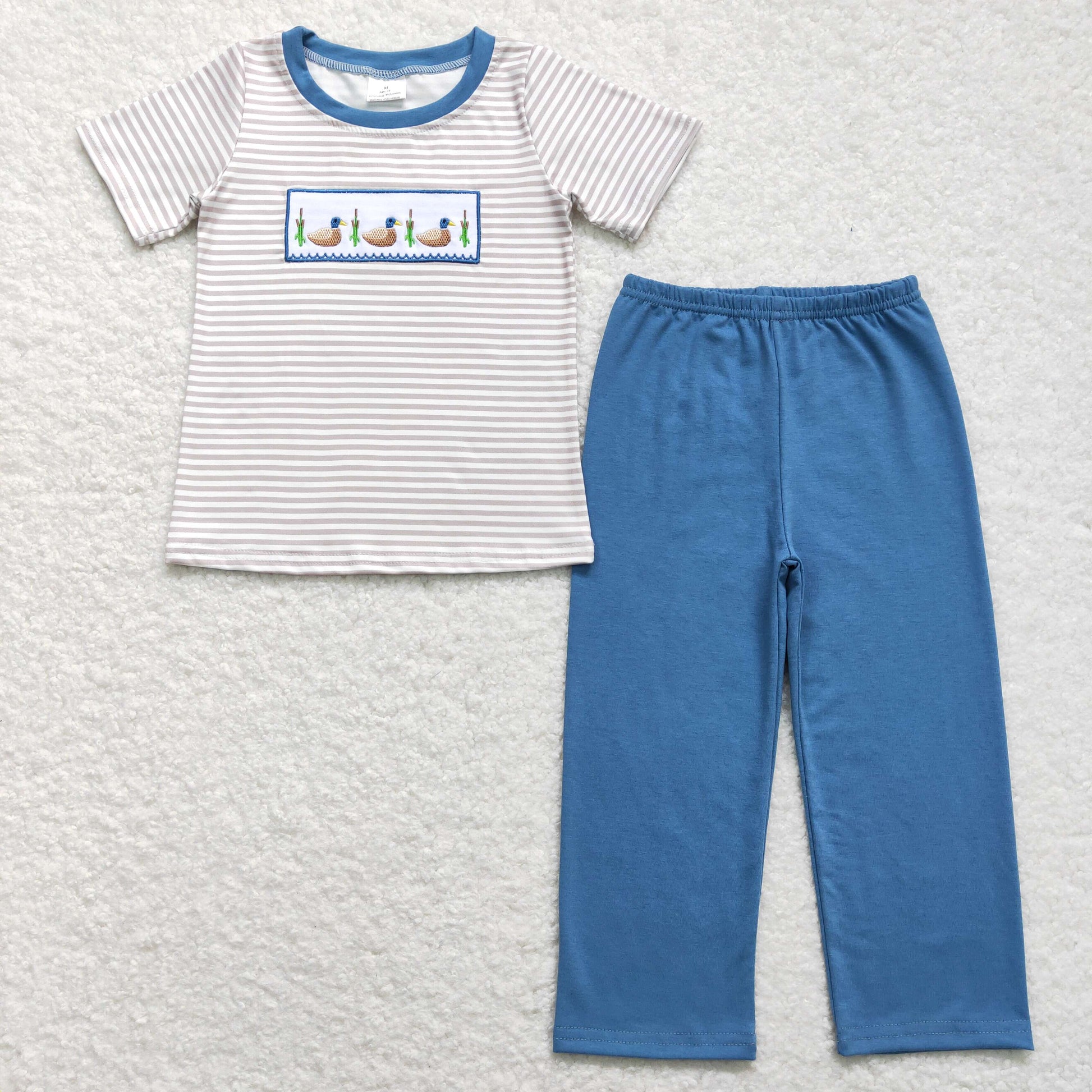 BSPO0305 Embroidered Ducks Stripe Blue Short Sleeve Pants Boys Outfits RTS 202508