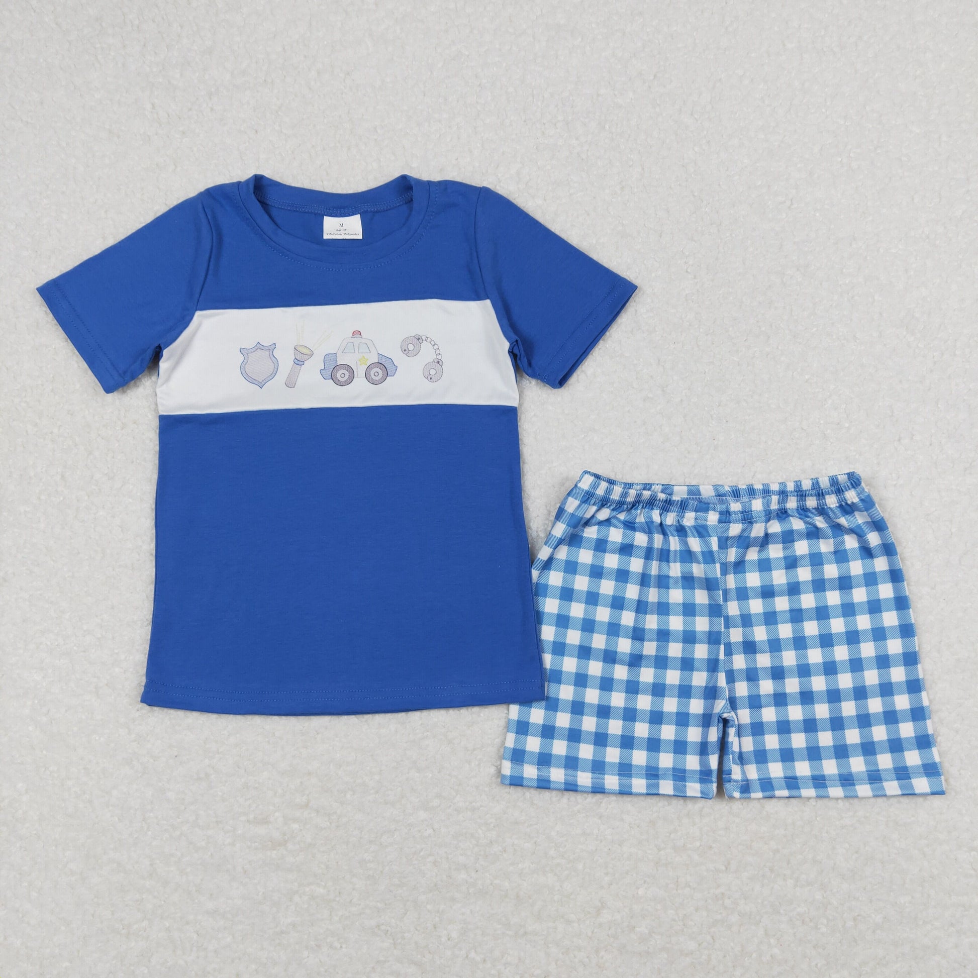 BSSO0665 Police Car Blue Short Sleeve Plaid Shorts Boys Outfits RTS 202508