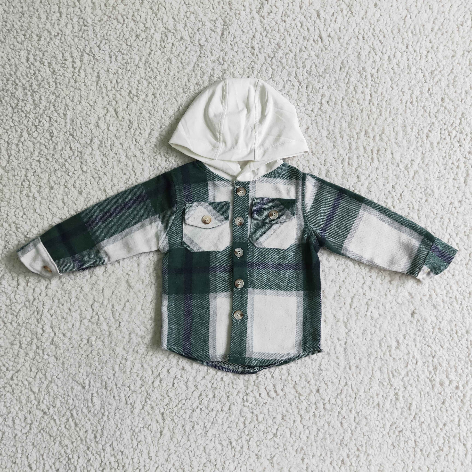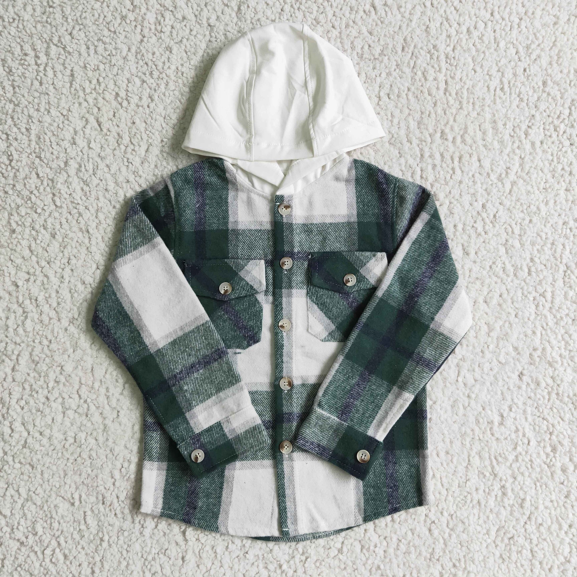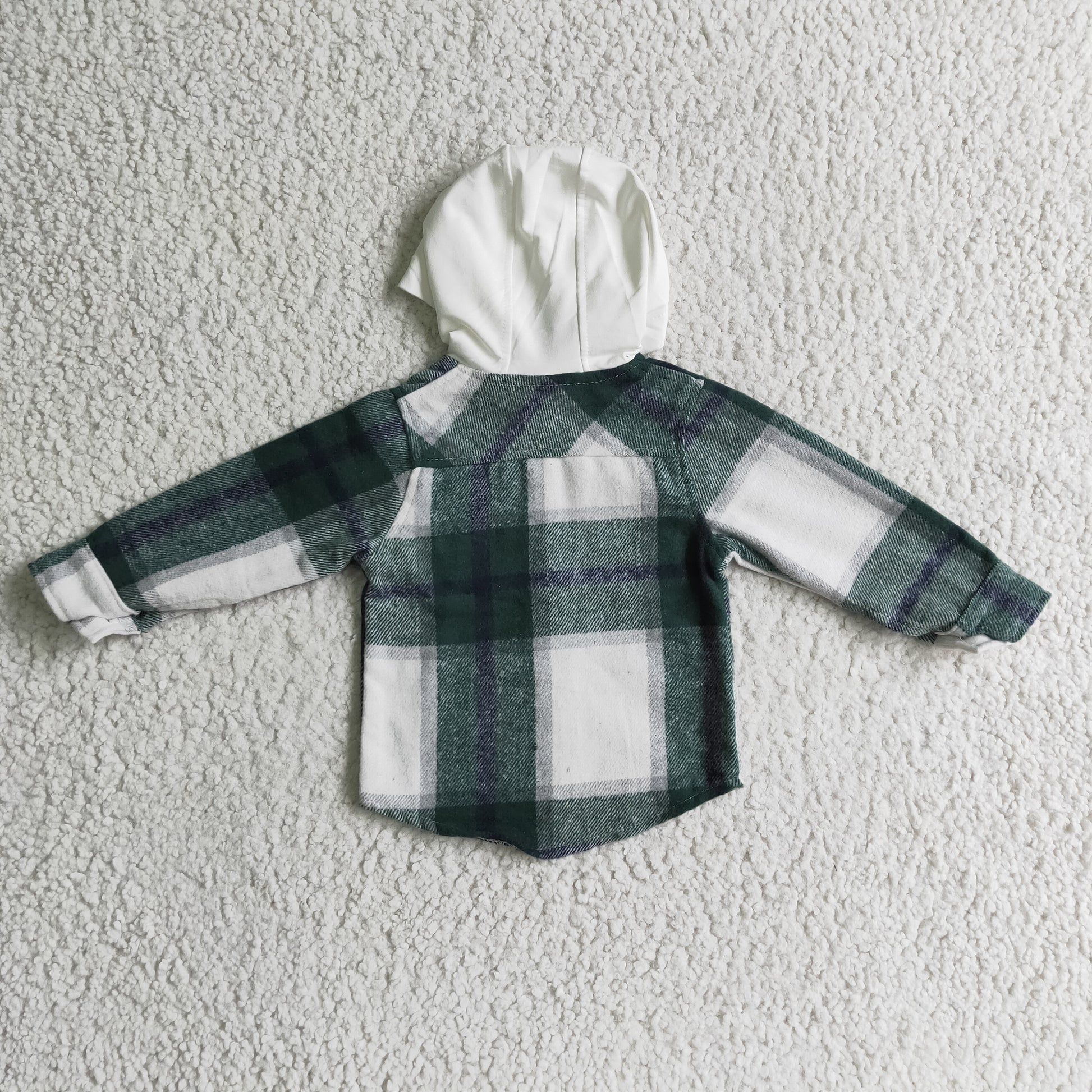 BT0075 Green Plaid White Pockets Boys Long Sleeve Hoodies Top