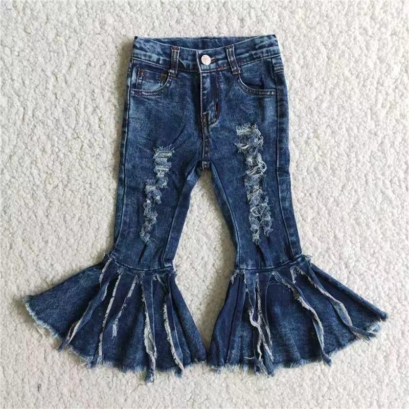 C4-23 Blue Distress Girls Double Ruffles Denim Jeans