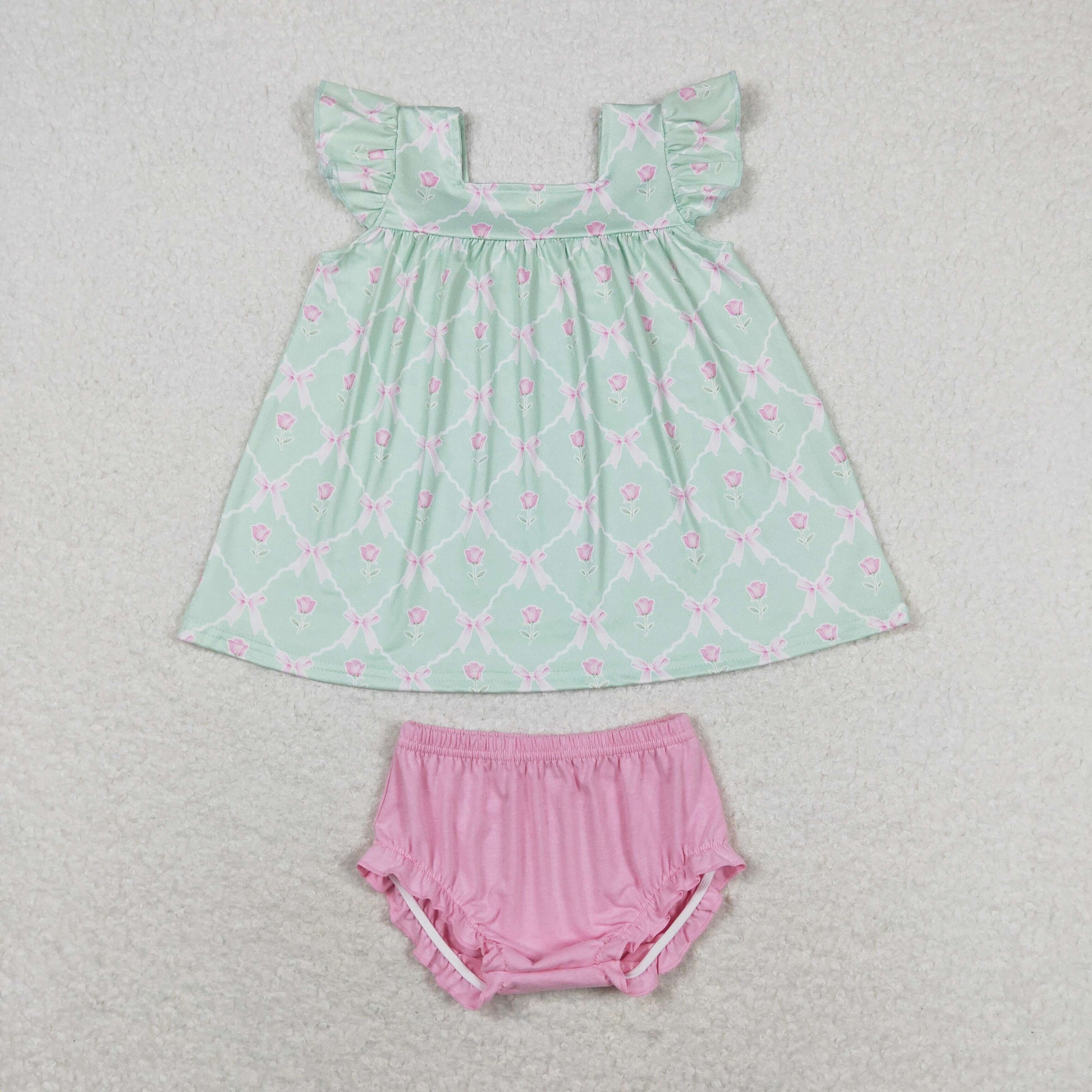 GBO0353 Flower bow green flying sleeve pink briefs set high quality baby girl clothing sets summer