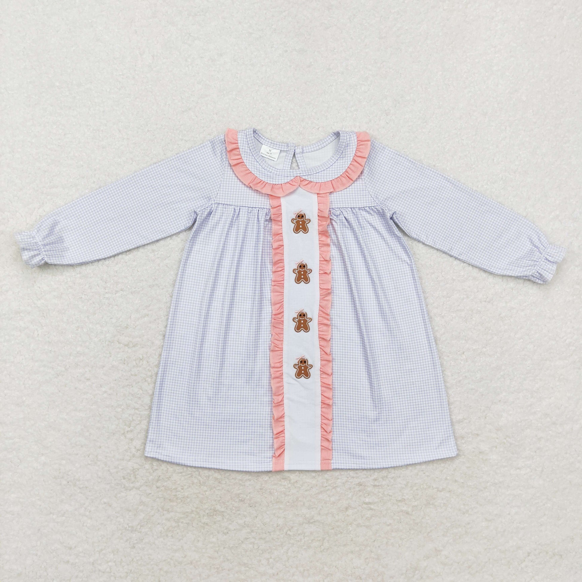 GLD0571 Embroidered gingerbread Man Pink Lace doll collar blue plaid long-sleeved dress