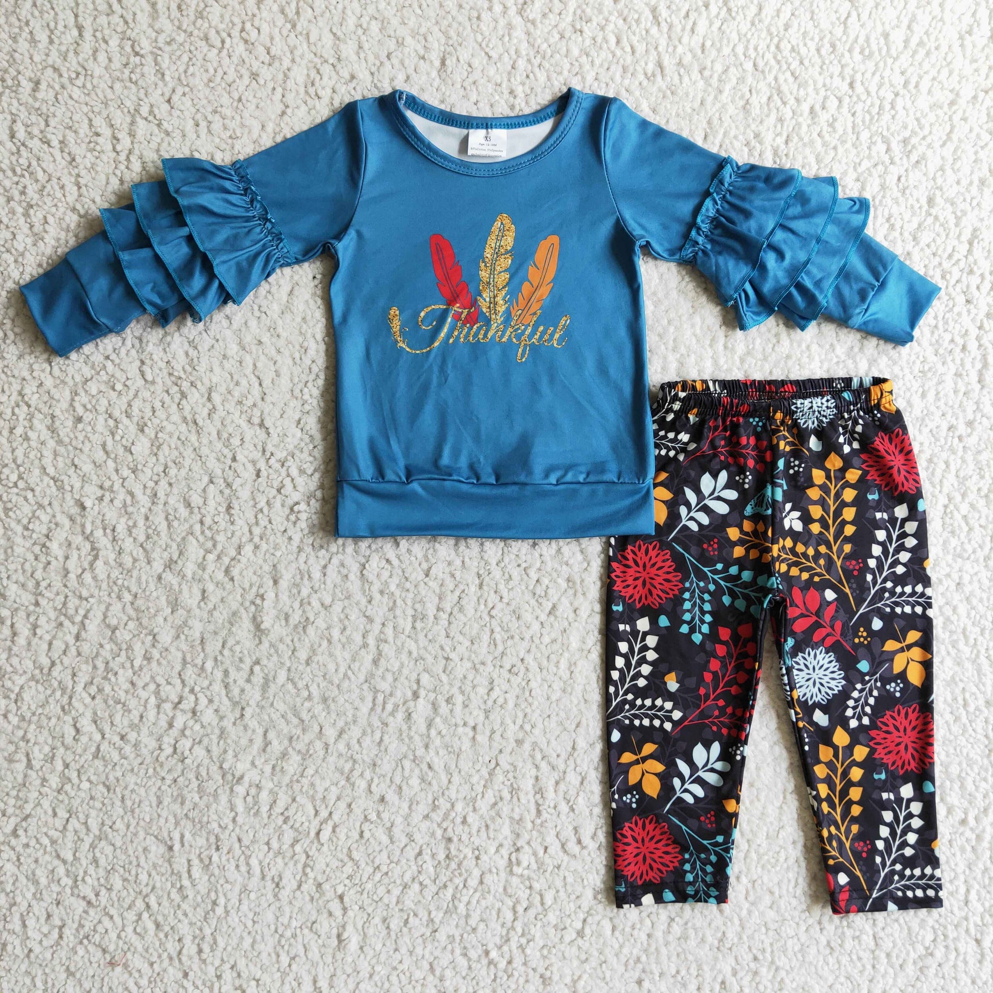 GLP0325 Thanksgiving Thankful Blue Floral Ruffles Girls Long Sleeve Pants Outfits