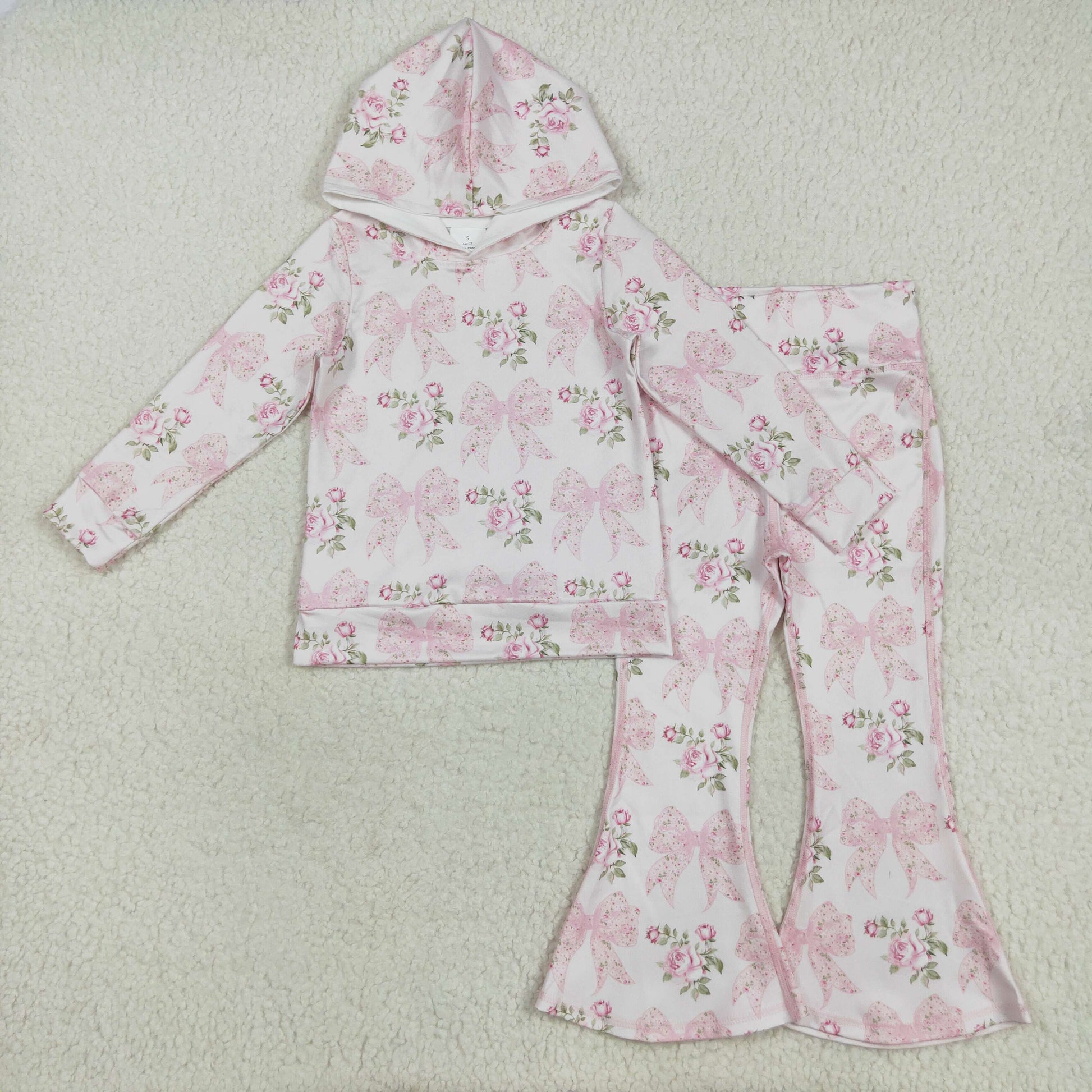 GLP2614 Girls Bow Flower Light Pink Hooded Long Sleeve Bell Bottom Pants Sets 202507 RTS