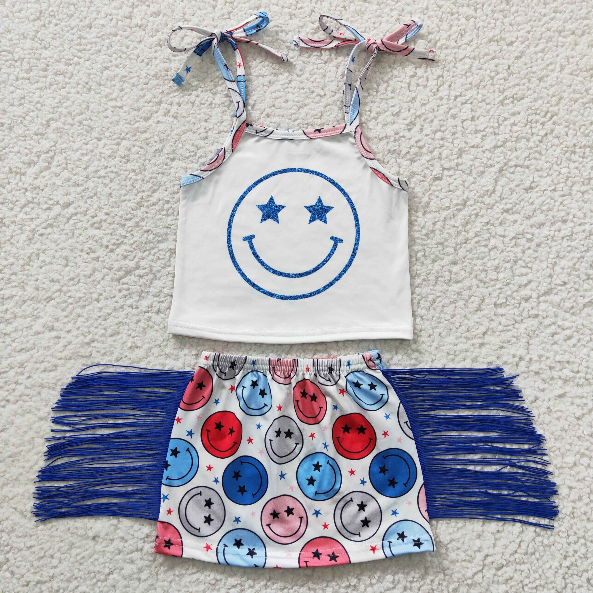 GSD0325 4th Of July Red Blue Smile Girls Short Sleeve With Skirt Dresses Outfits