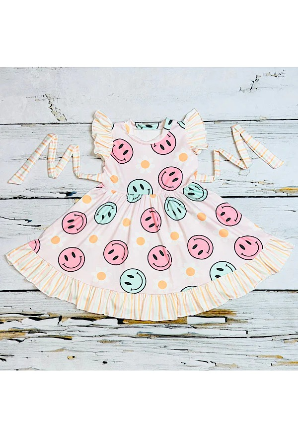 GSD0407 Pink Yellow Smile Emoji Belt Girls Short Sleeve Dresses