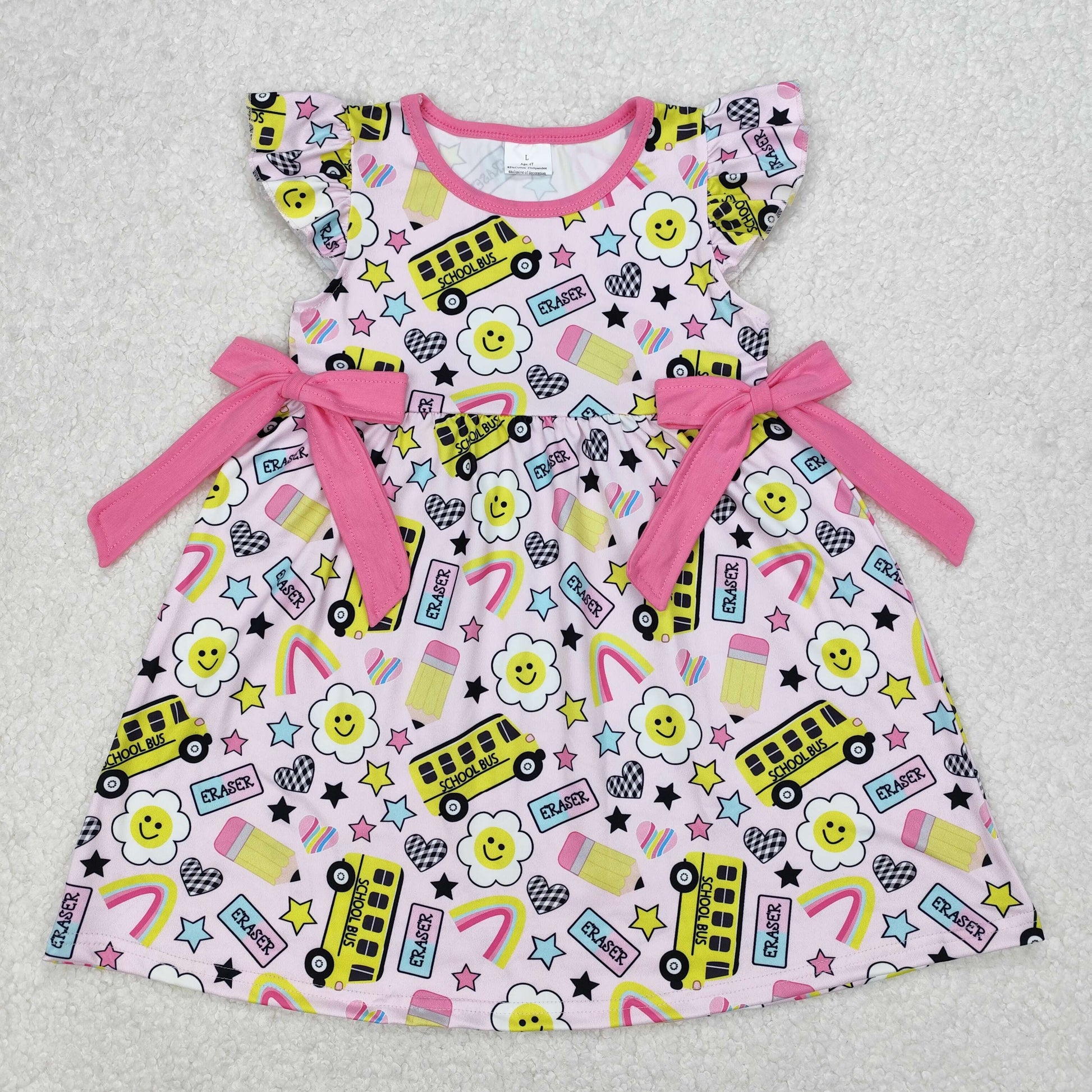GSD1822 Flower Star Bus Hot Pink Bows Flag Flying Sleeve Dress Girls Boutique Clothes 202503 RTS