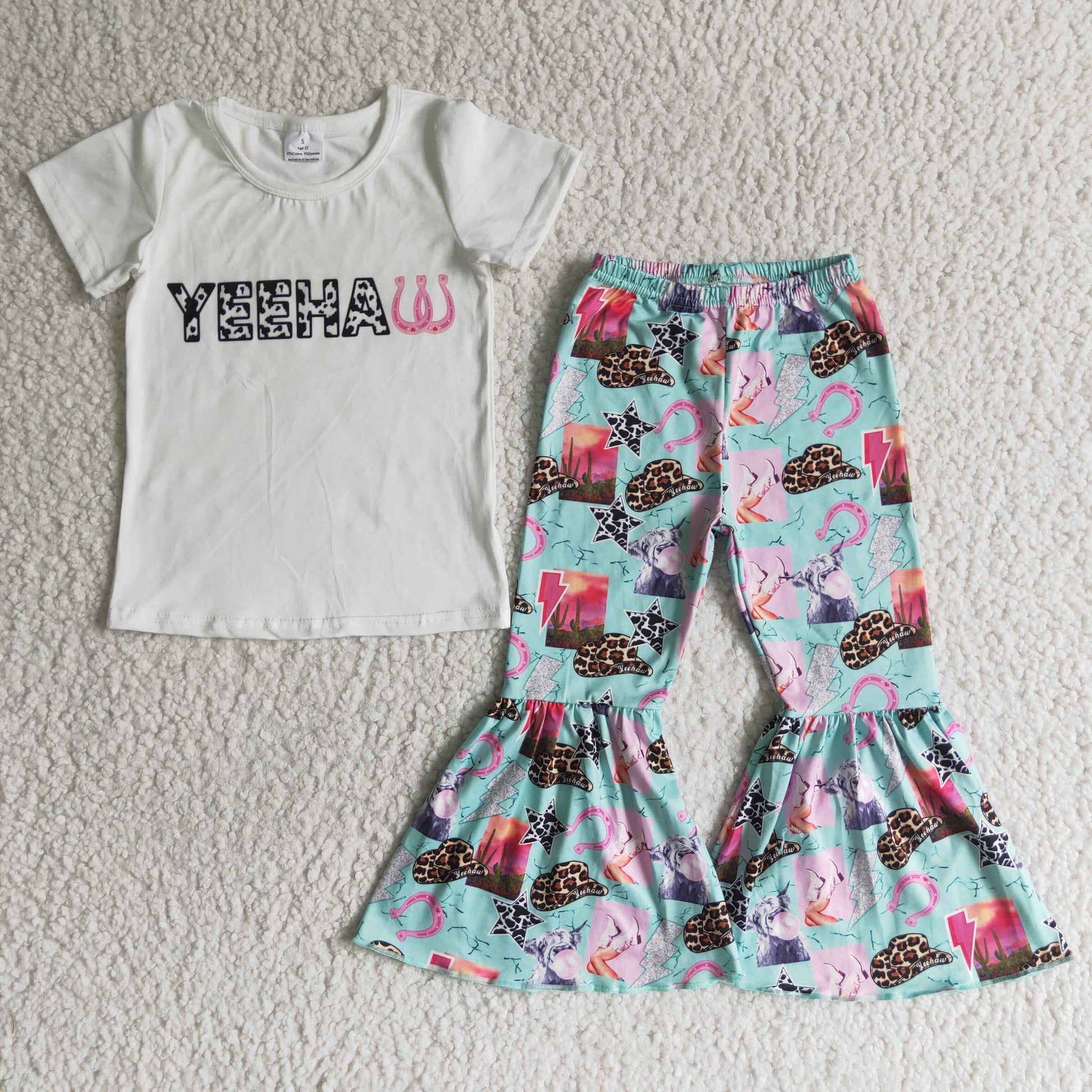 GSPO0032 YEEHAW Blue Leopard Cowboy With Bow 3pcs Girls Short Sleeve Pants Outfits