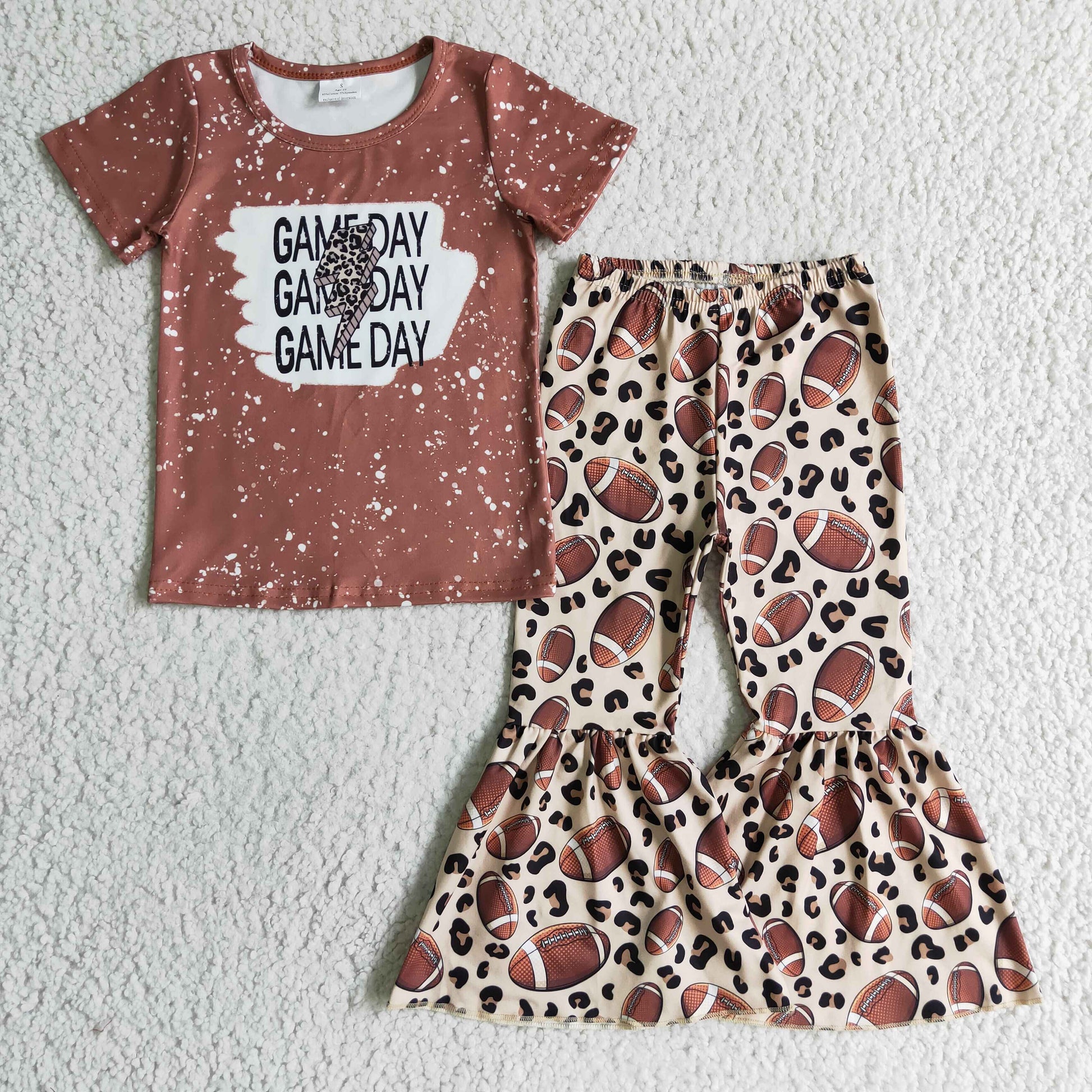 promotion RTS GSPO0216 Brown Leopard Football Game Day Girls Short Sleeve Bell Bottom Pants Outfits