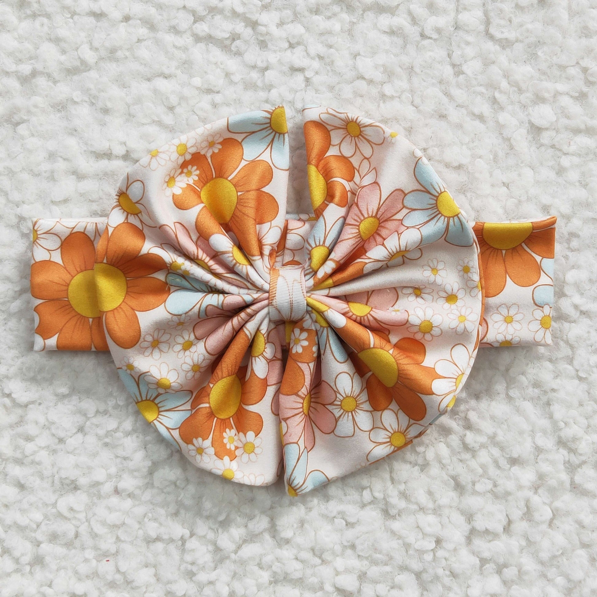 GSPO0508 Orange Floral Yellow With Bow Headband 3pcs Girls Short Sleeve Bell Bottom Pants Outfits