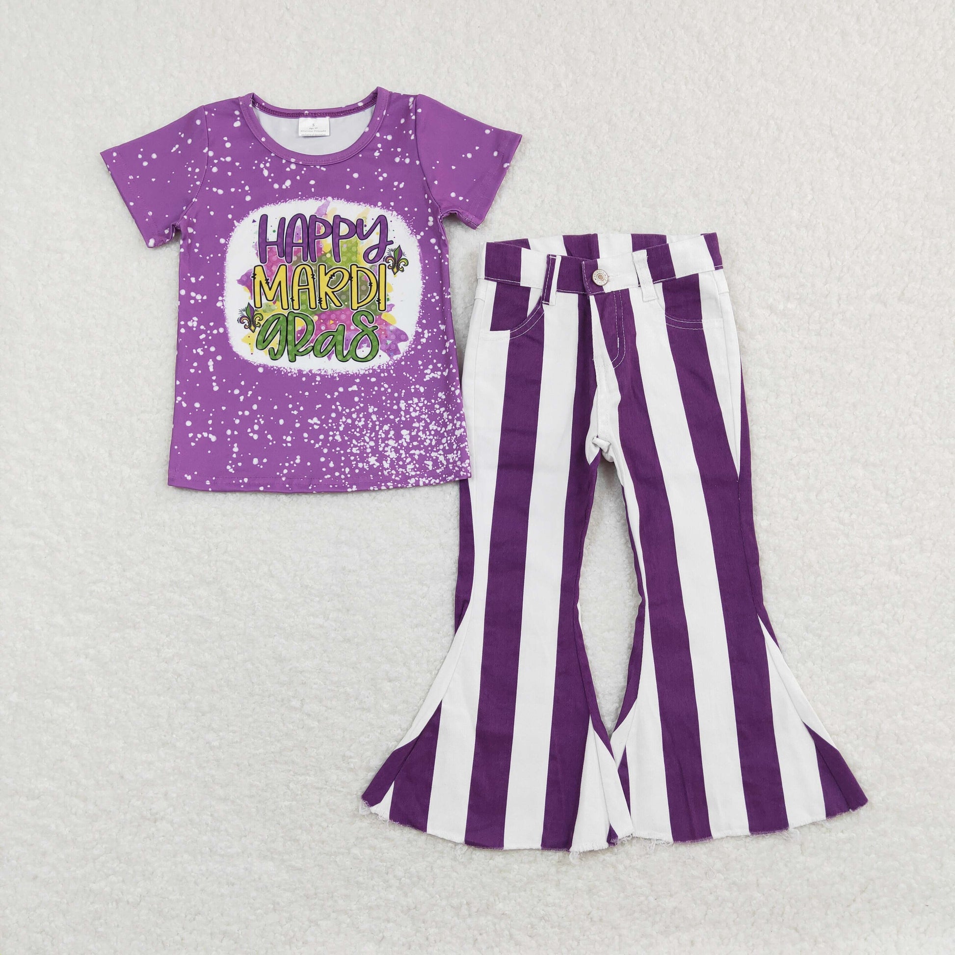 GSPO1123 Happy Mardi Gras apparel Purple short sleeve top denim bell bottom pants Girls Boutique outfits 202501