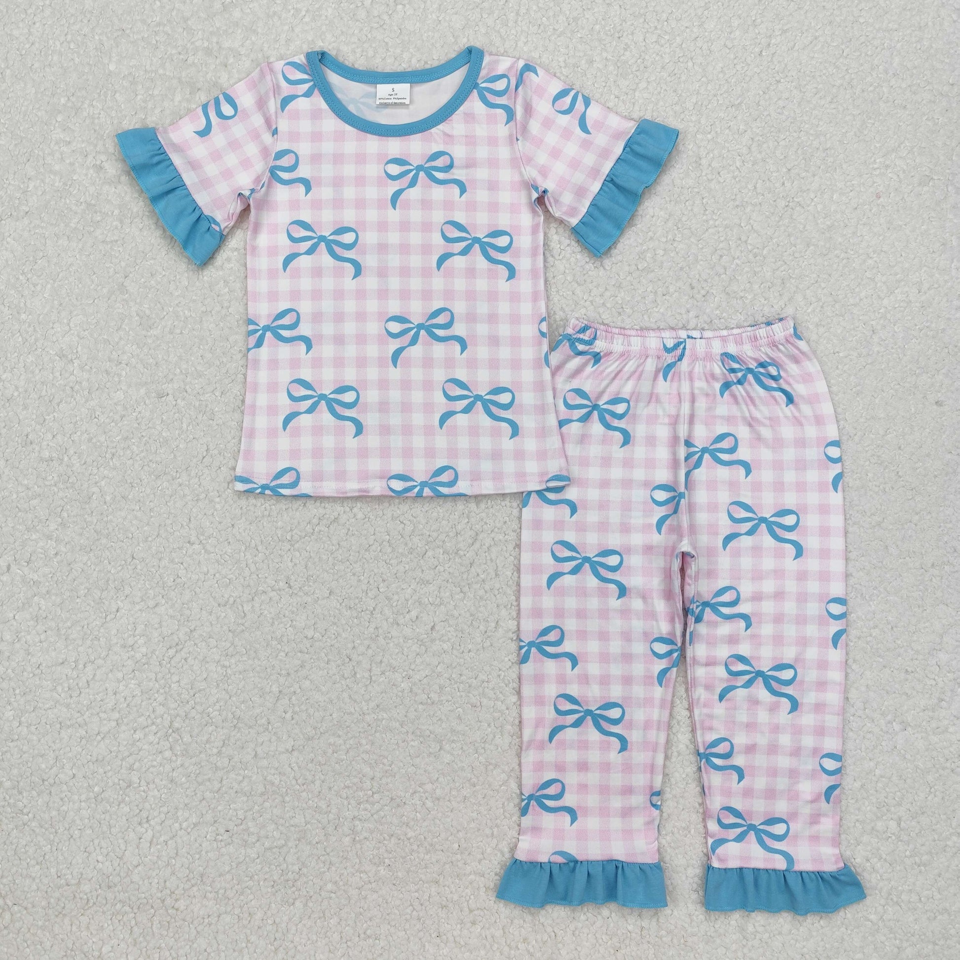 GSPO1736 Blue Green Ruffle sets with bows valentines boutique outfit short sleeve top RTS 202412