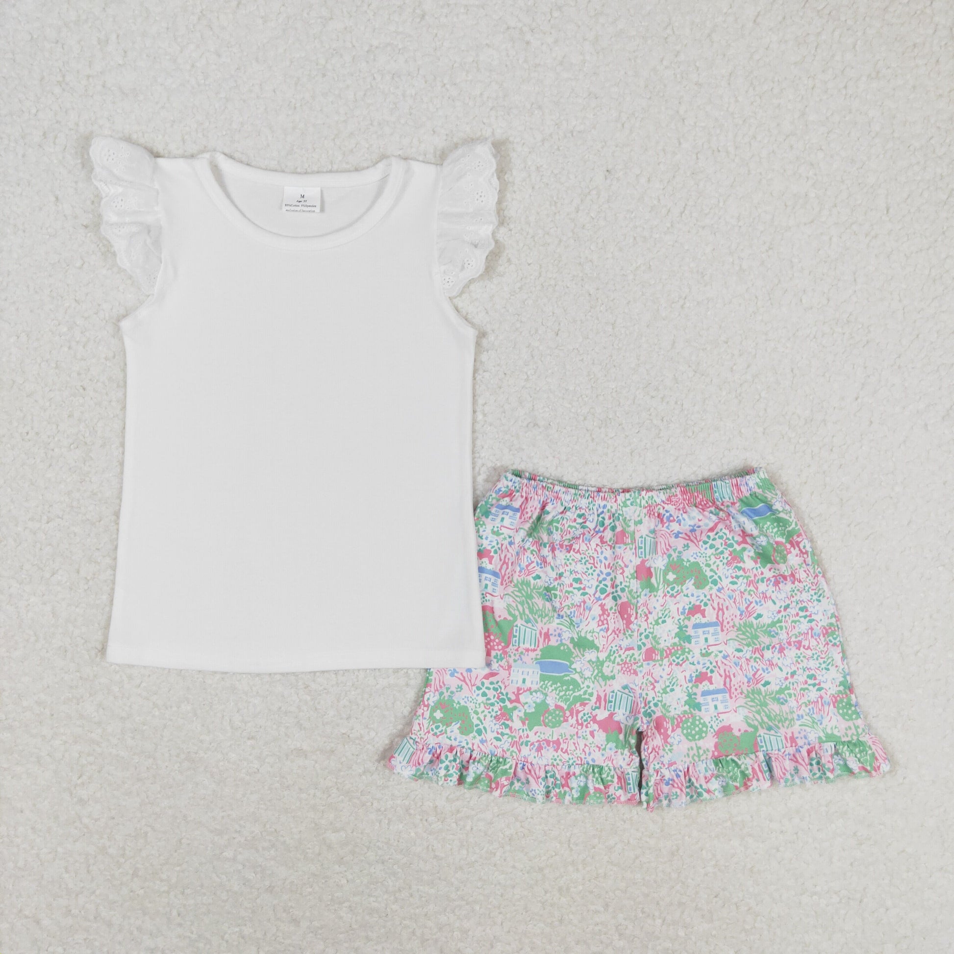 GSSO0888 Solid color White flying sleeve flower green shorts set High quality kids clothing set for girls