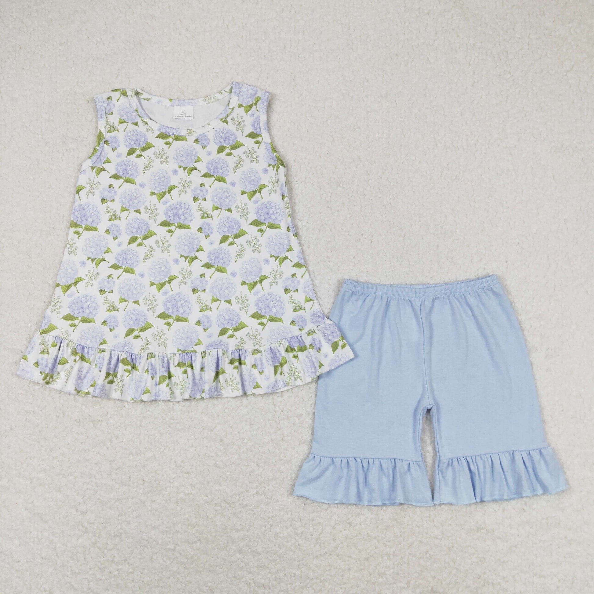 GSSO1050 Hydrangea beige lace sleeveless blue shorts set high quality girls clothing sets baby girls