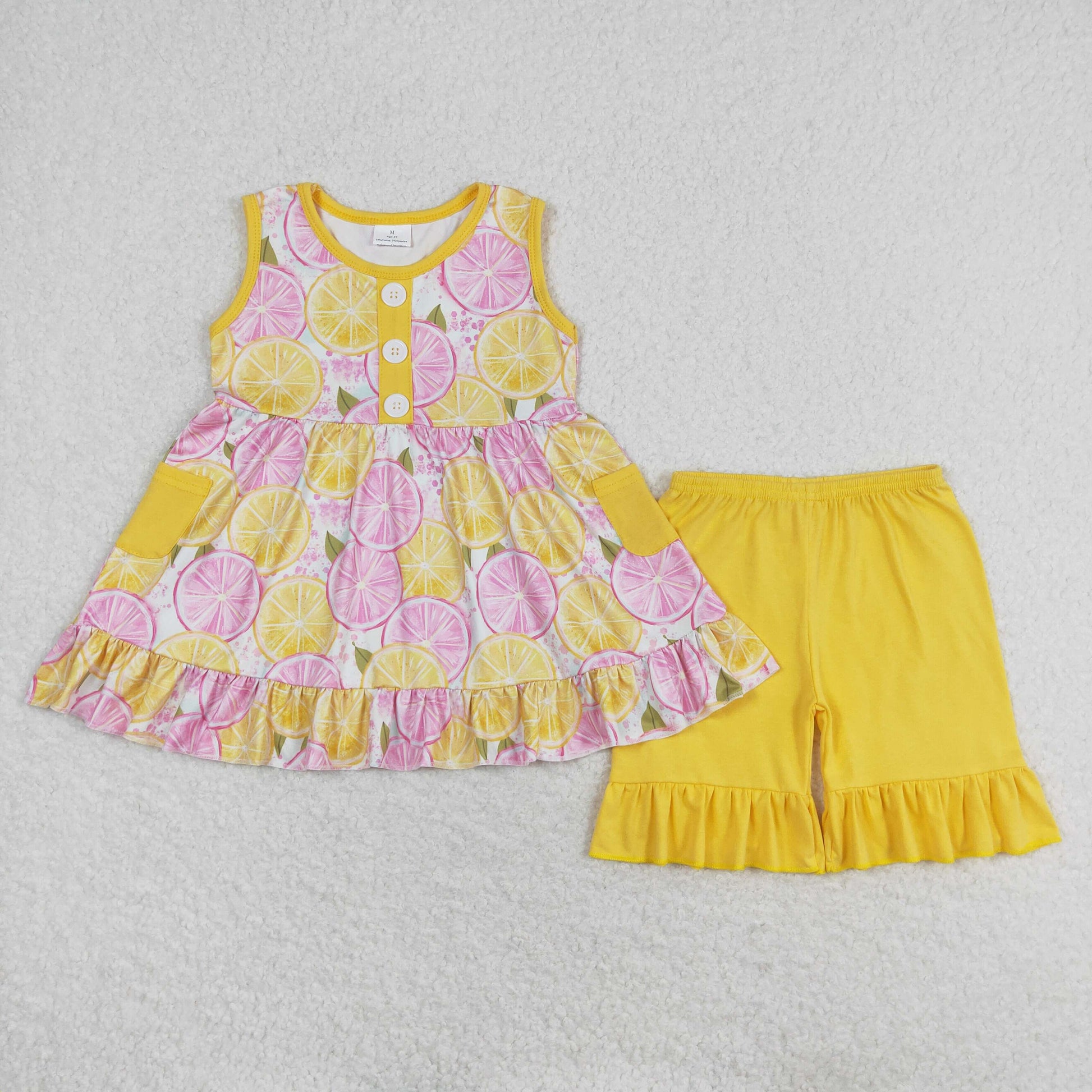 GSSO1079 Orange fruit pattern yellow sleeveless shorts set High quality little girls clothing sets