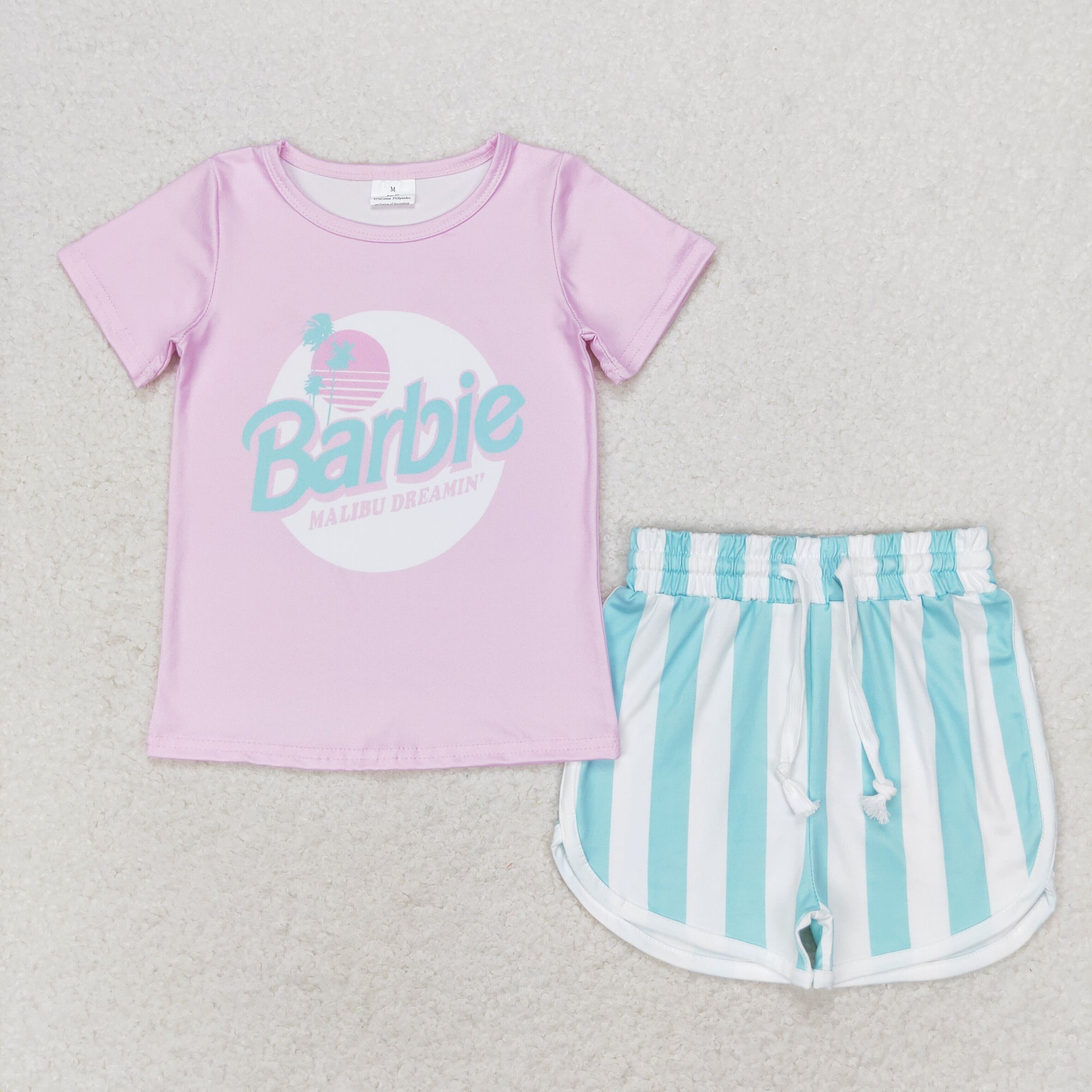 GSSO1168 Barbie pink short-sleeved striped shorts suit