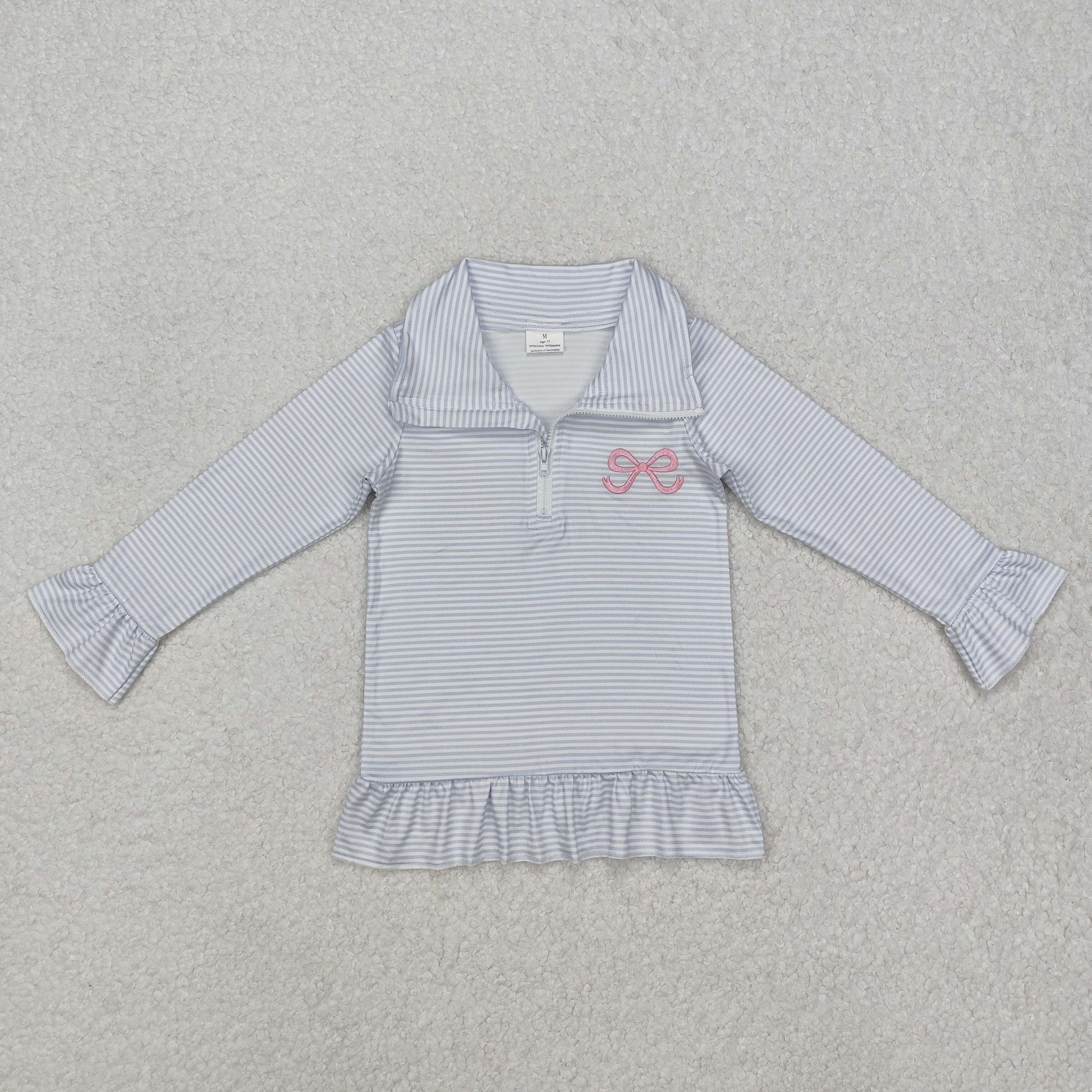 GSSO1724 Blue Striped Stand-Up Ruffle long sleeve top with embroidery bow outfit Baby girl Boutique outfit RTS 202412