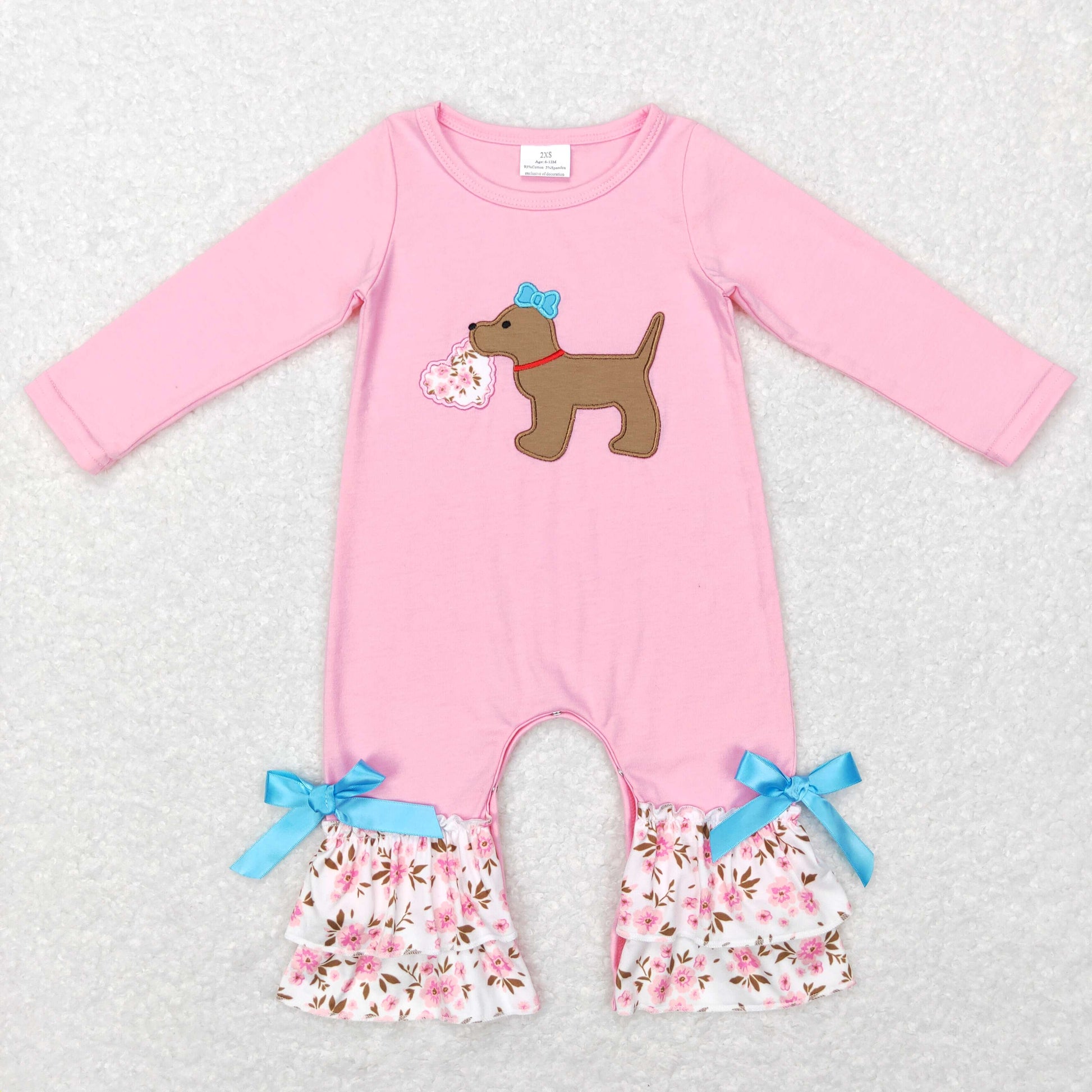 LR0789 Baby girls valentines outfit Pink long sleeve double lace Bow Romper with puppy love heart pattern RTS 202412
