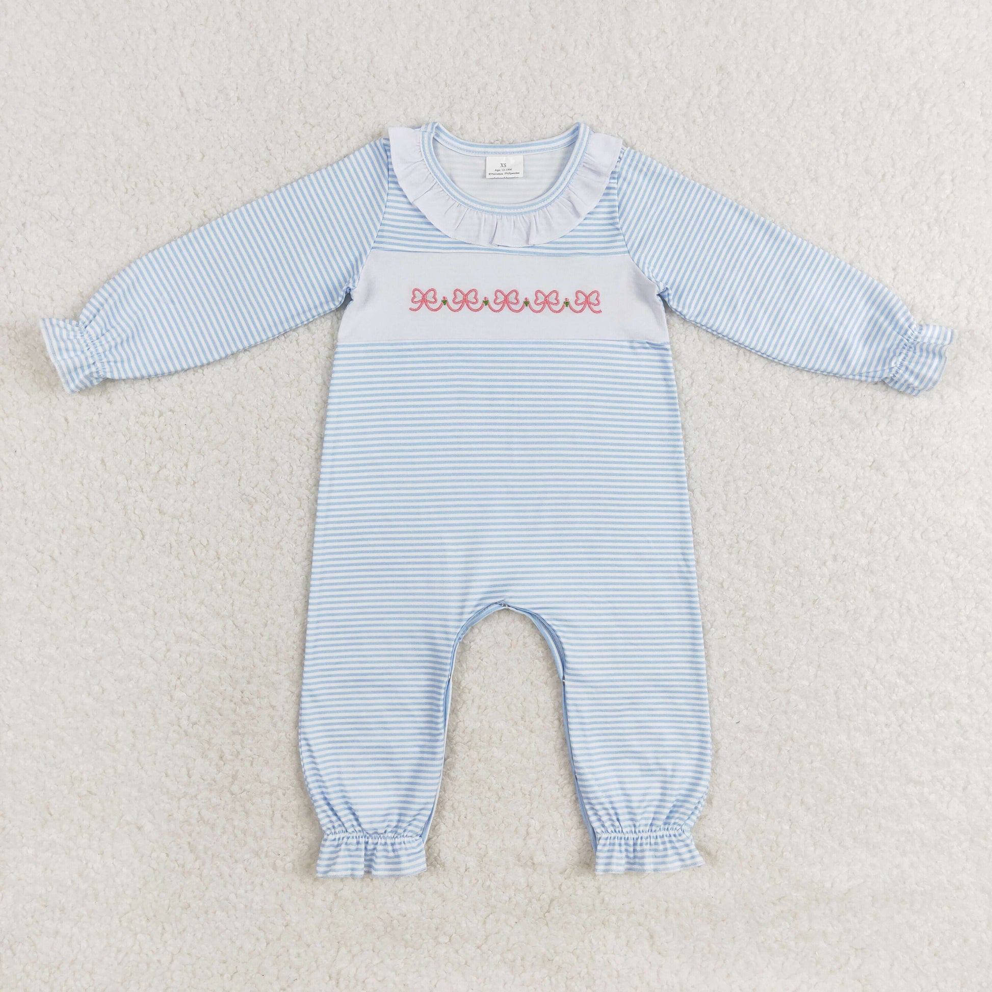 LR0941 Vintage Long Sleeve Romper with Embroidery Bow Pattern White Lace and Blue Striped No MOQ Cartoon Style Clothes
