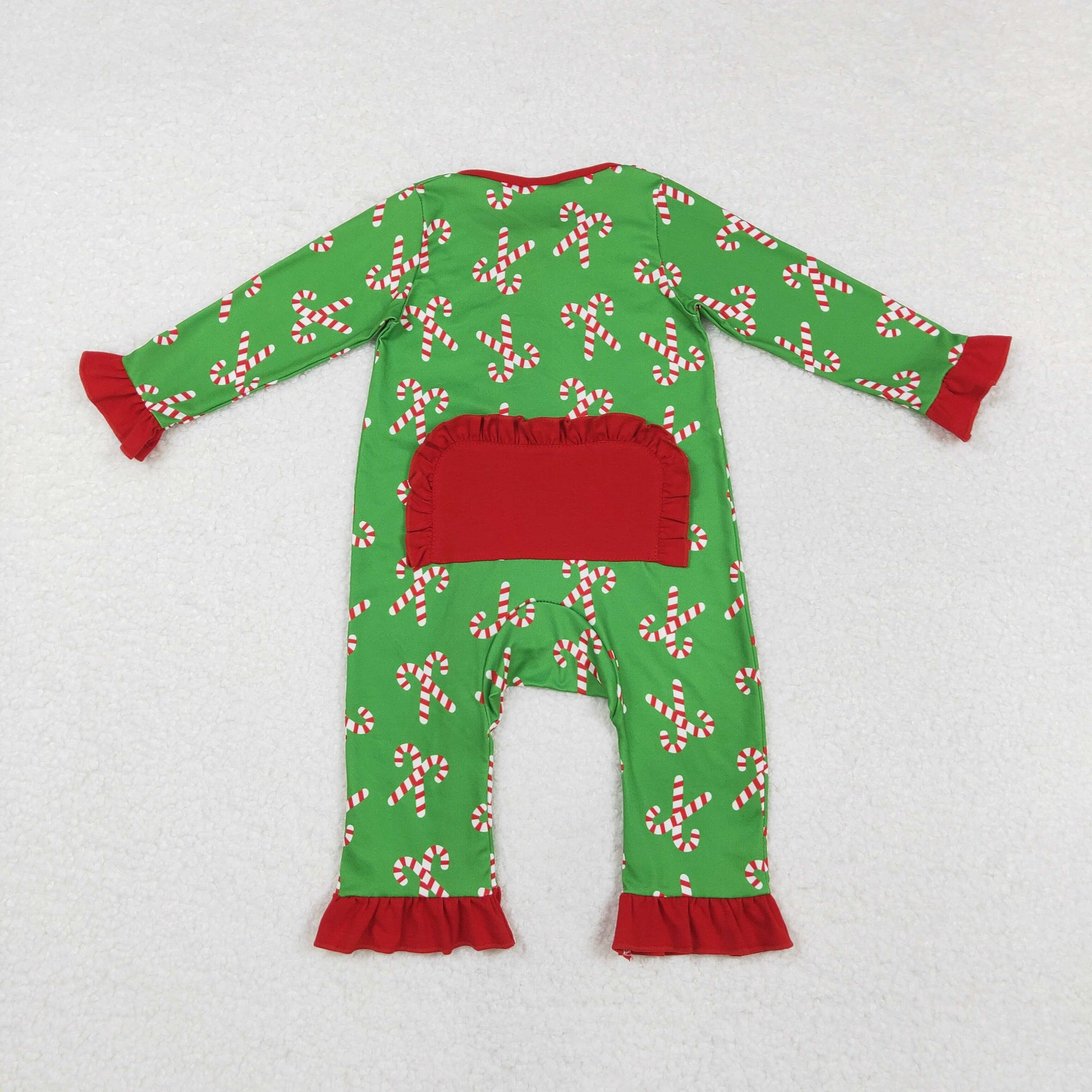 LR1236 Christmas Santa Cane Red Ruffle Border Zipper Green Long-Sleeved Girls Romper RTS 202509